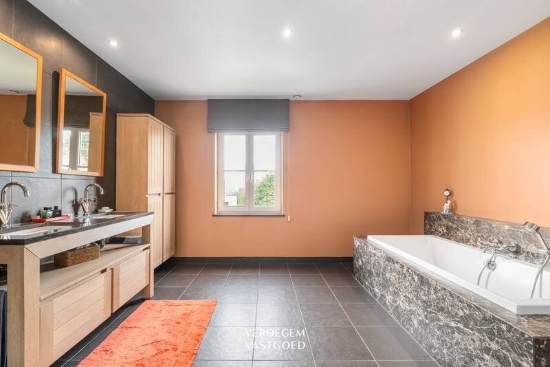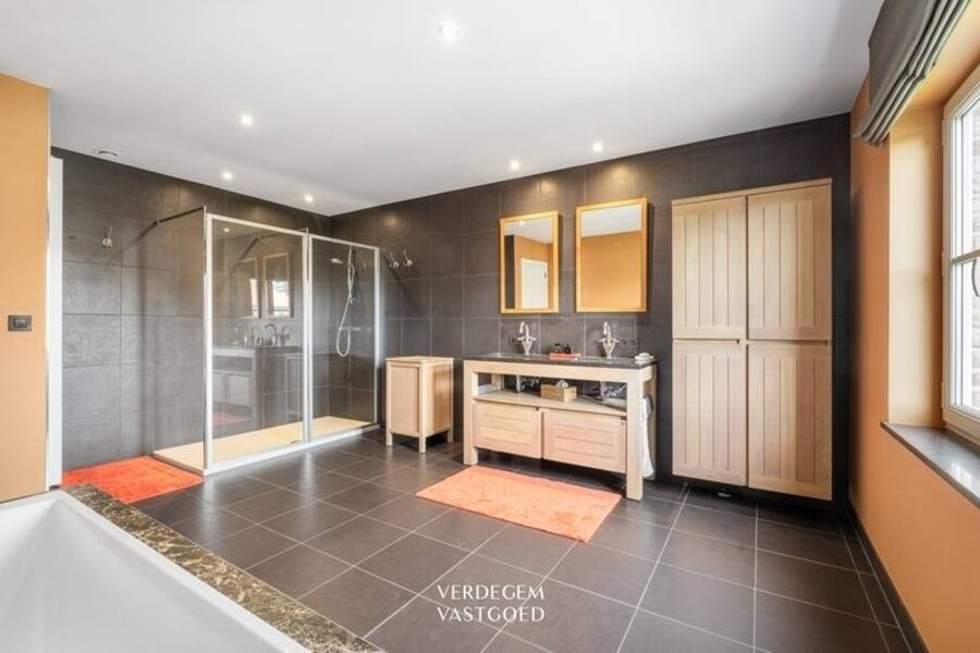 De grote badkamer beschikt over een vrijstaand bad, inloopdouche en dubbele wastafel.