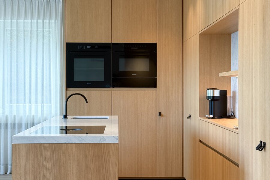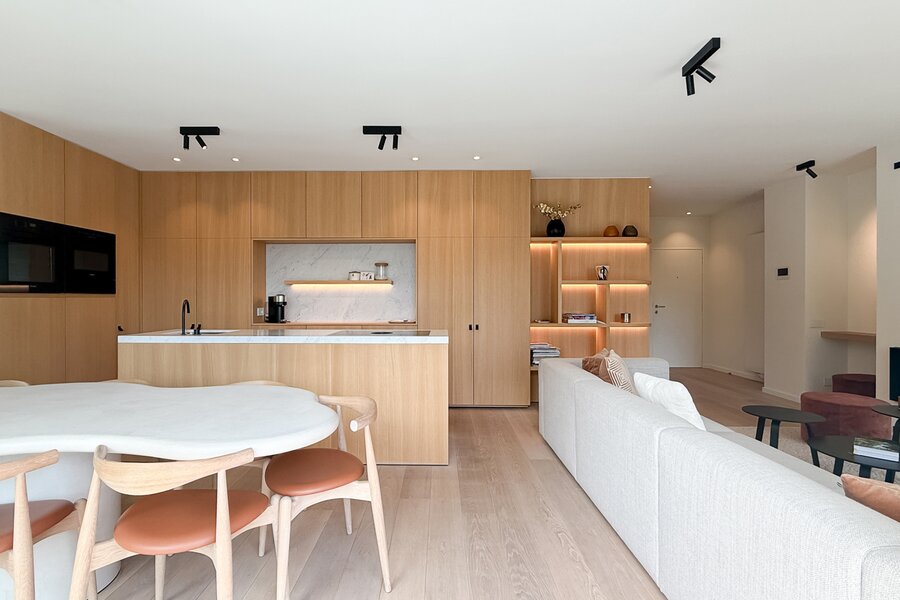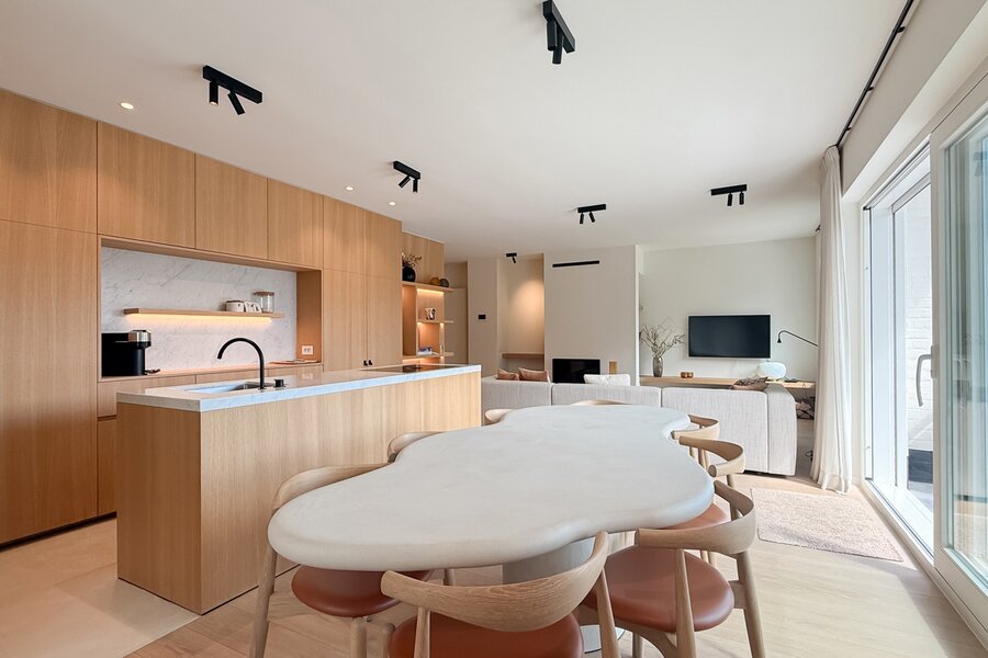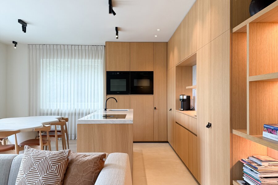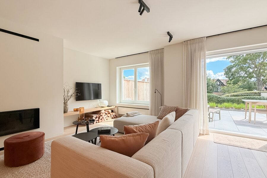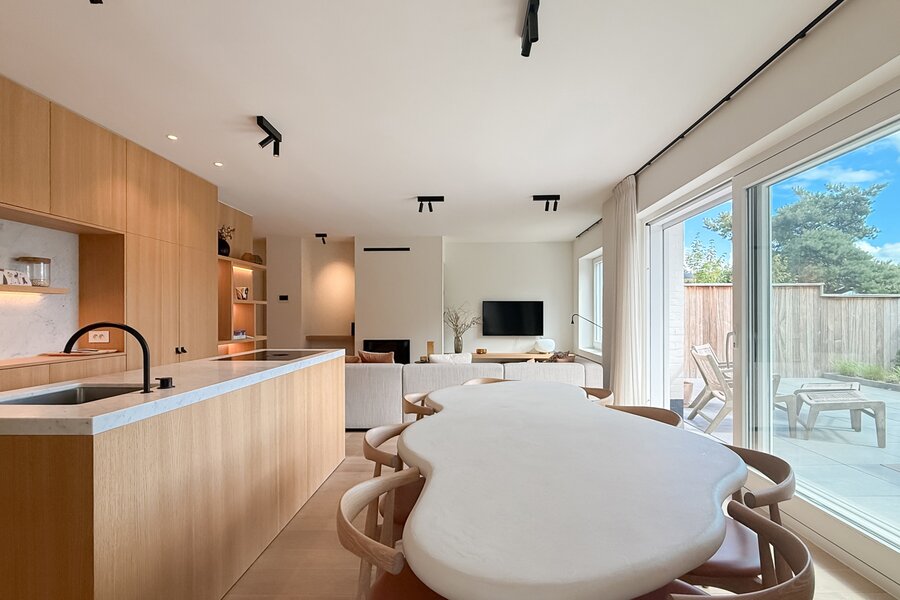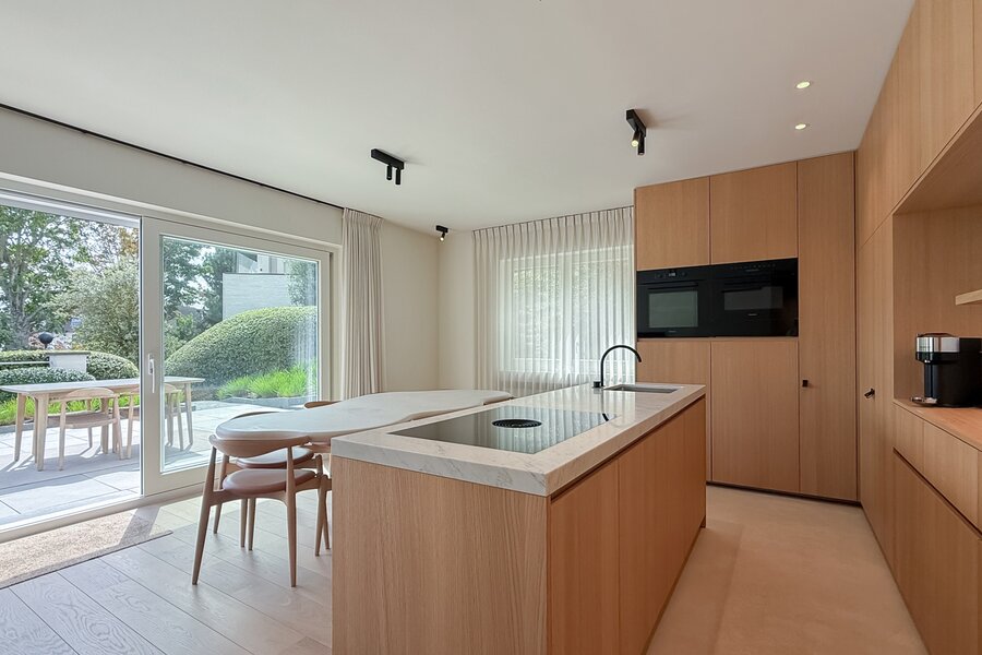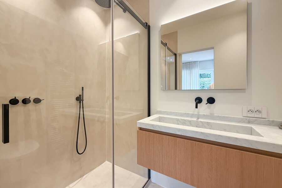 De leefruimtes zijn royaal opgevat en baden in natuurlijk licht, met grote ramen die uitkijken op het zuidwestgerichte terras en de prachtig aangelegde privatieve tuin. Binnen werd gekozen voor een afwerking die luxe ademt: carrara marmer, geolied eiken parket en subtiel beton ciré zorgen voor een verfijnde harmonie, terwijl domotica en hoogwaardige technieken het hedendaagse comfort garanderen.