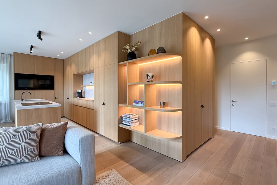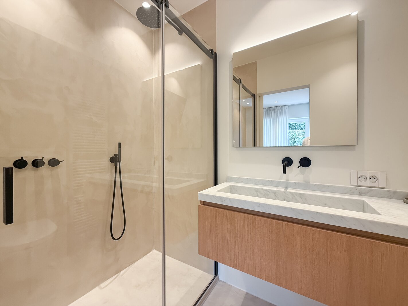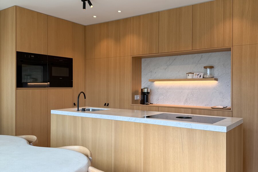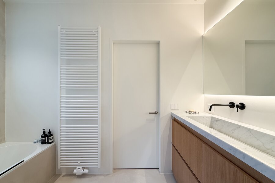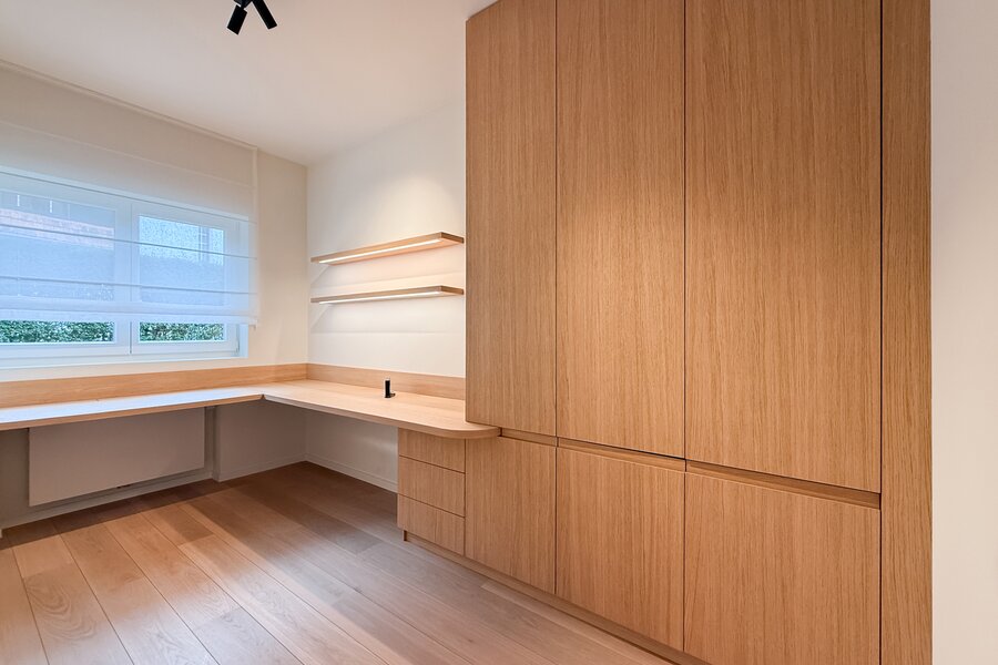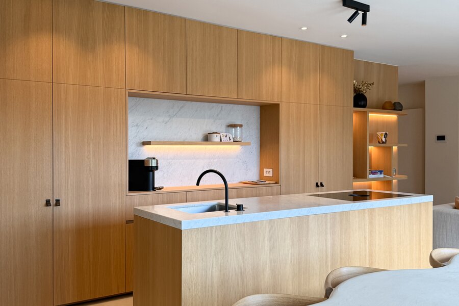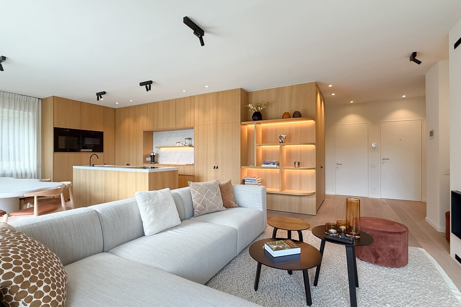 De leefruimtes zijn royaal opgevat en baden in natuurlijk licht, met grote ramen die uitkijken op het zuidwestgerichte terras en de prachtig aangelegde privatieve tuin. Binnen werd gekozen voor een afwerking die luxe ademt: carrara marmer, geolied eiken parket en subtiel beton ciré zorgen voor een verfijnde harmonie, terwijl domotica en hoogwaardige technieken het hedendaagse comfort garanderen.