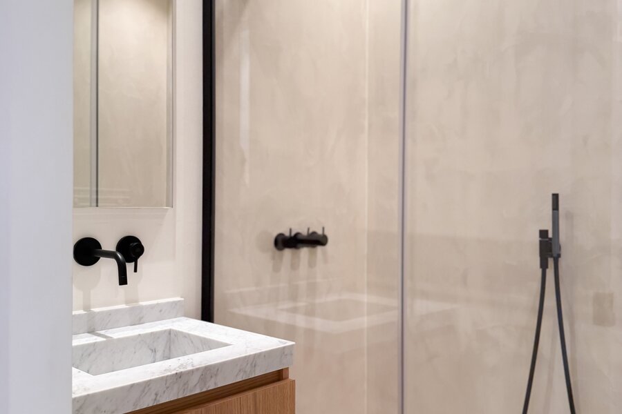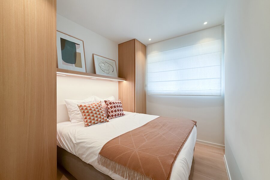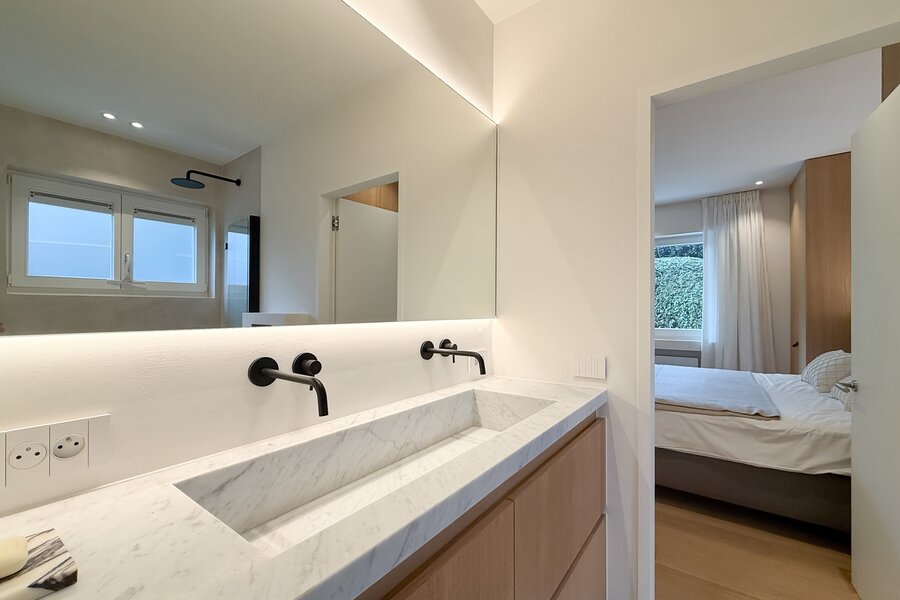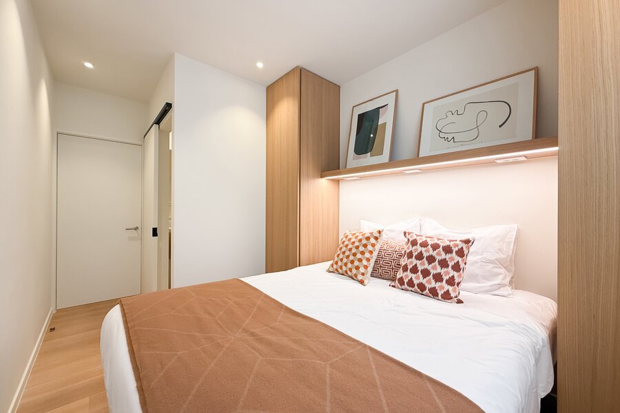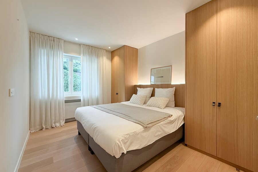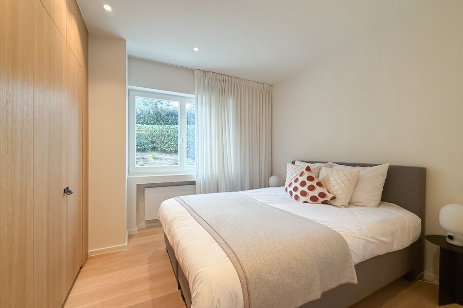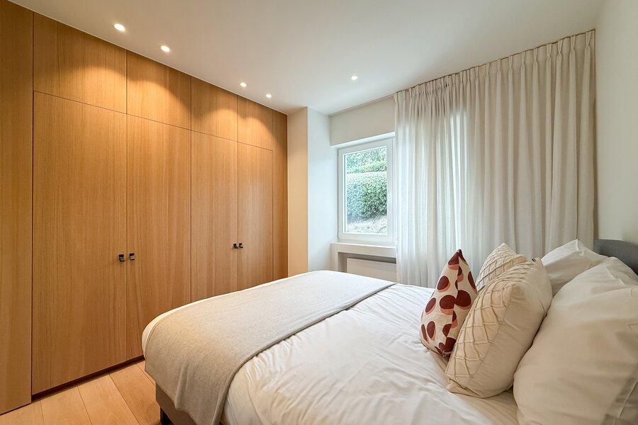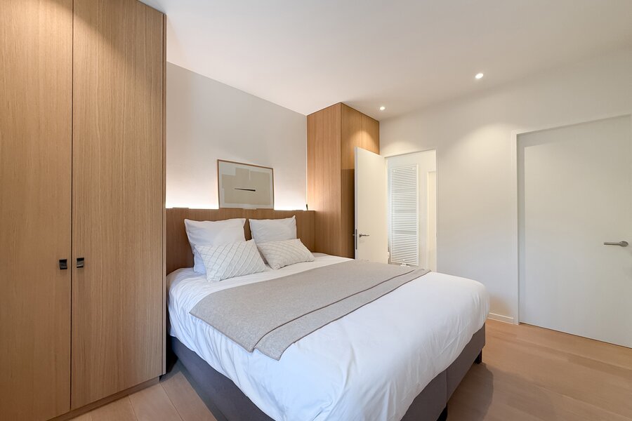 De master suite is een intieme cocon van rust en stijl, met een eigen badkamer die aanvoelt als een privéspa. De bijkomende slaapkamers, elk met hun eigen douchekamer, combineren comfort met elegantie, en maken dit appartement ideaal om gasten in alle discretie te ontvangen.