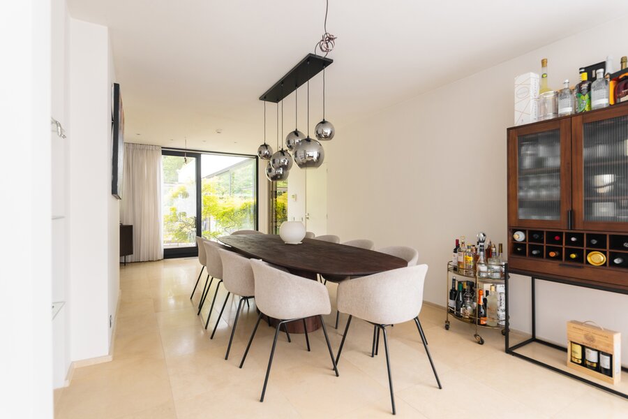 Aangrenzend ligt de hypergeïnstalleerde keuken, met hoogwaardige toestellen van Miele. Ontbijten en aperitieven kan hier aan het grote keukeneiland. Voor gezellige diners is er meer dan plaats genoeg in de ruime eetkamer.