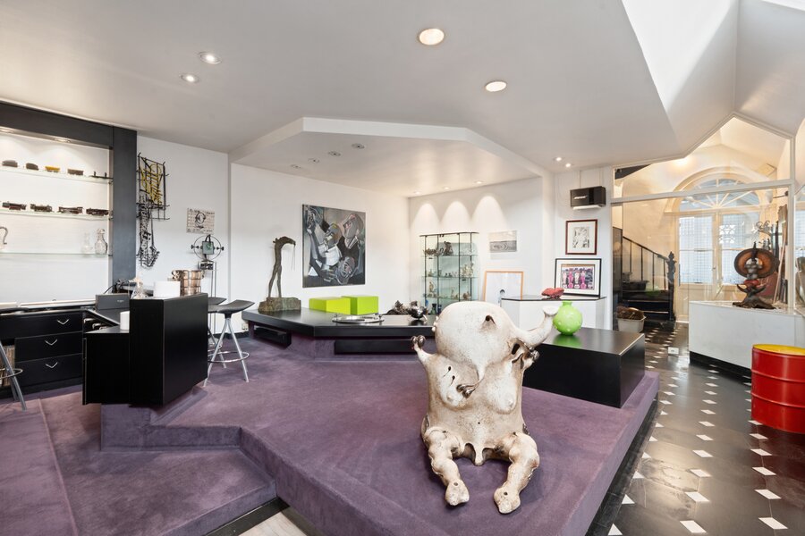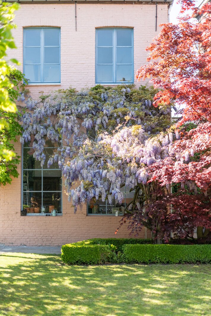 Achteraan het perceel bevindt zich nog een industrieel gebouw in twee bouwlagen: de oorspronkelijke drukkerij. Dit volume biedt een waaier aan mogelijkheden: atelier, bijkomende woonruimte, werkplaats, showroom, hobbyruimte …