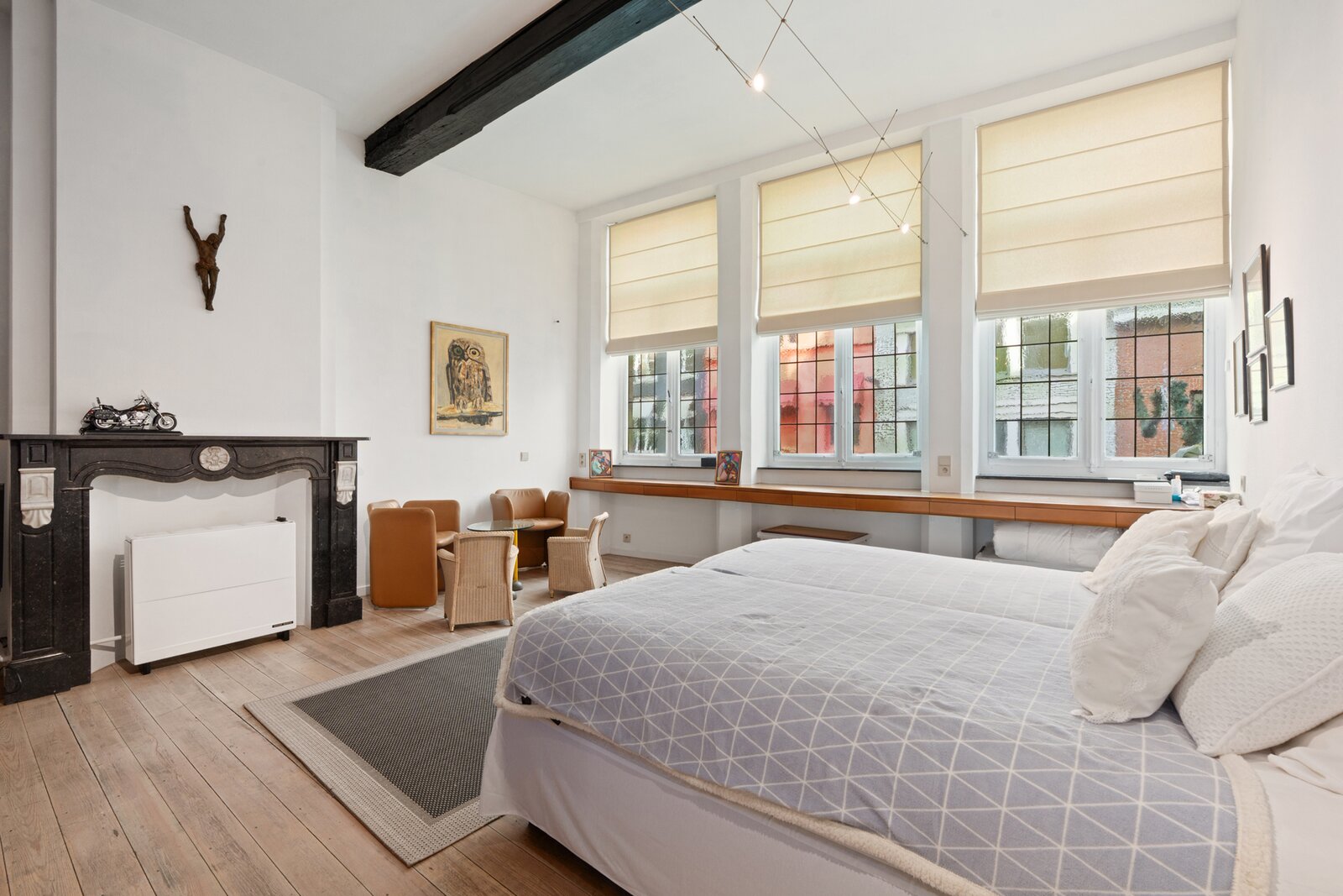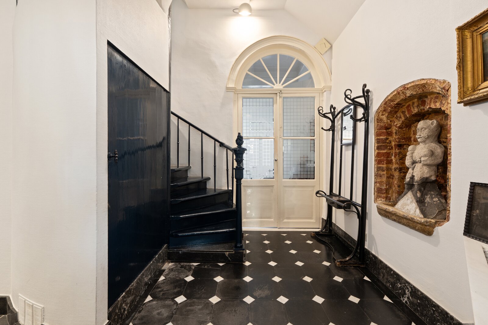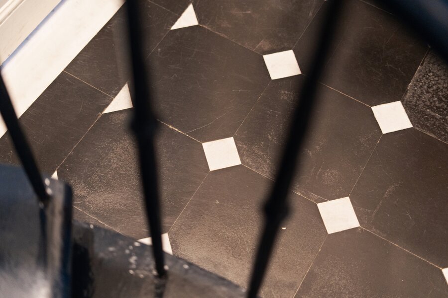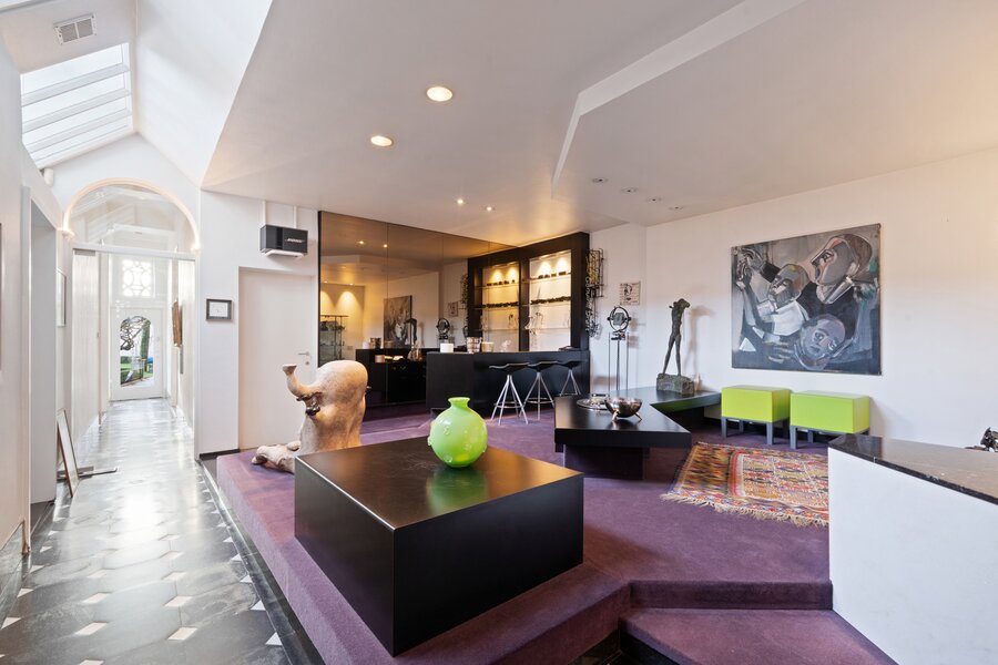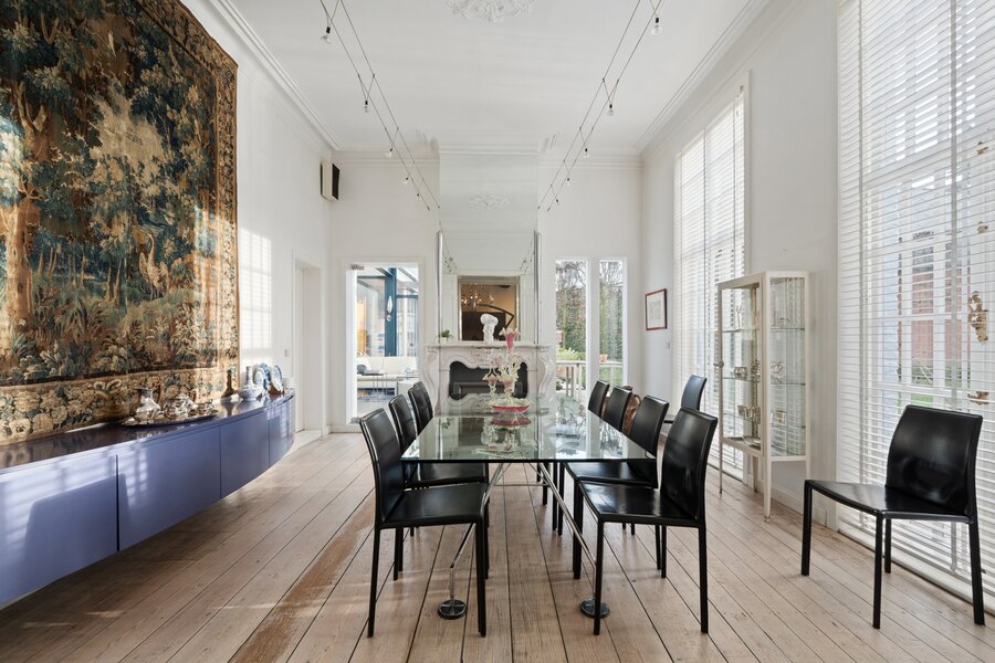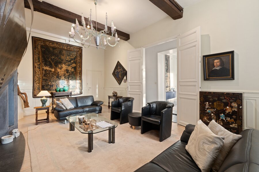 Binnen straalt de woning pure klasse uit dankzij de hoge plafonds, prachtige schouwen, unieke moulures, en authentieke vloeren en parket die doorheen het hele pand bewaard zijn.