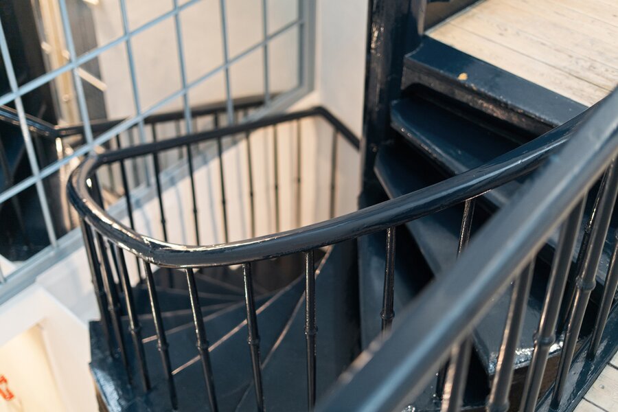 Een prachtige houten draaitrap leidt naar de eerste verdieping. Aan de straatzijde bevindt zich een ruime slaapkamer met eigen badkamer (douche en lavabo).