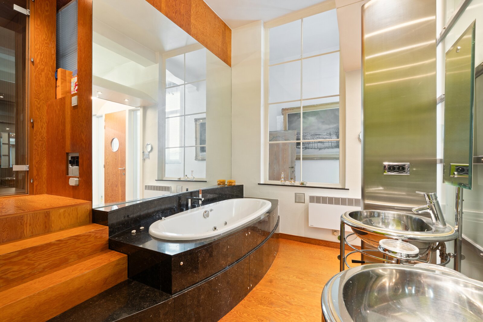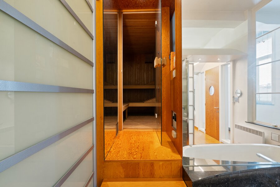 Via de nachthal bereiken we de master bedroom met en-suite hoofdbadkamer, uitgerust met bad, douche, toilet én sauna – een waar luxemoment in huis.