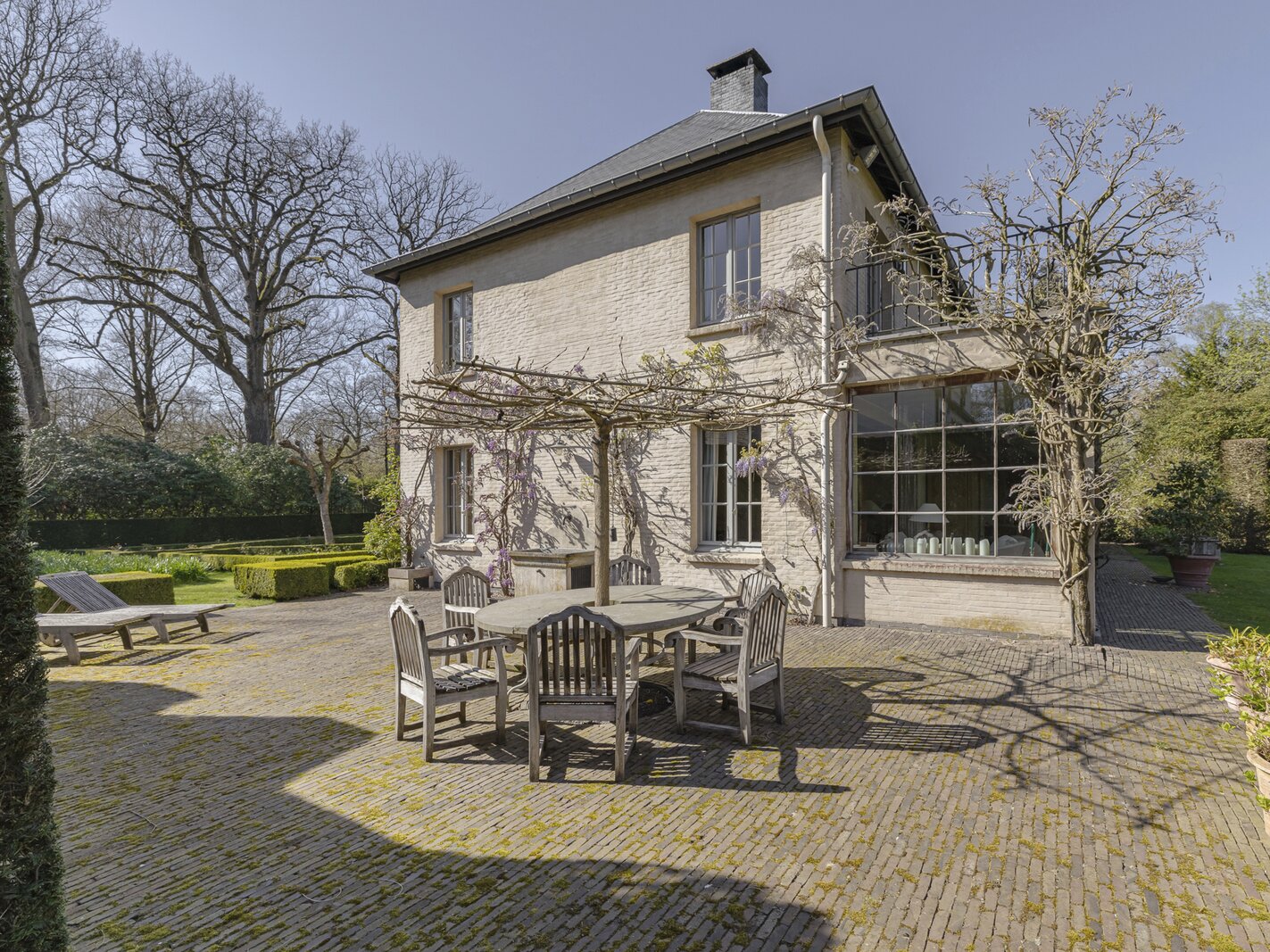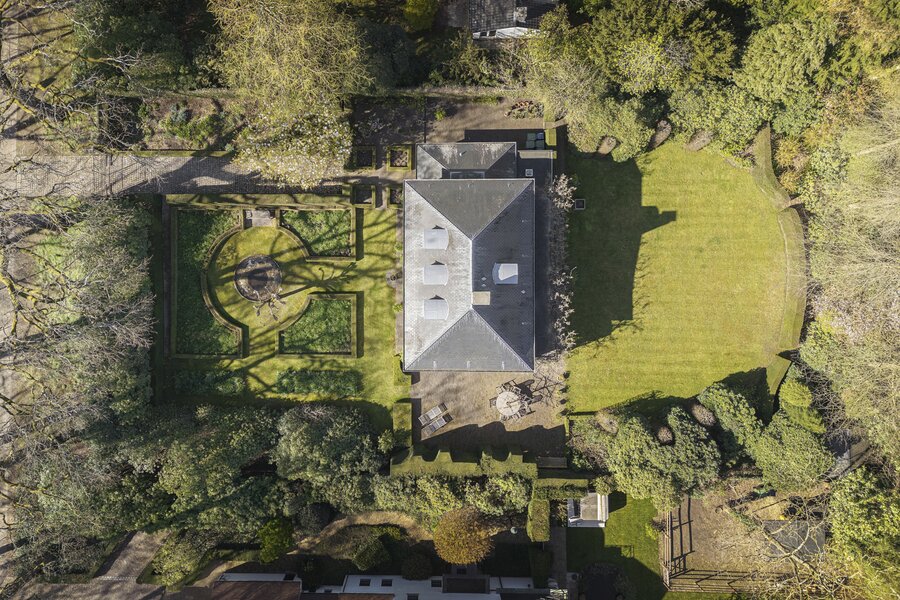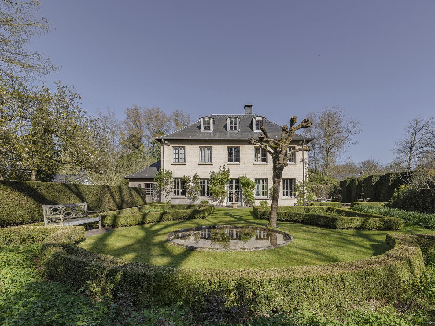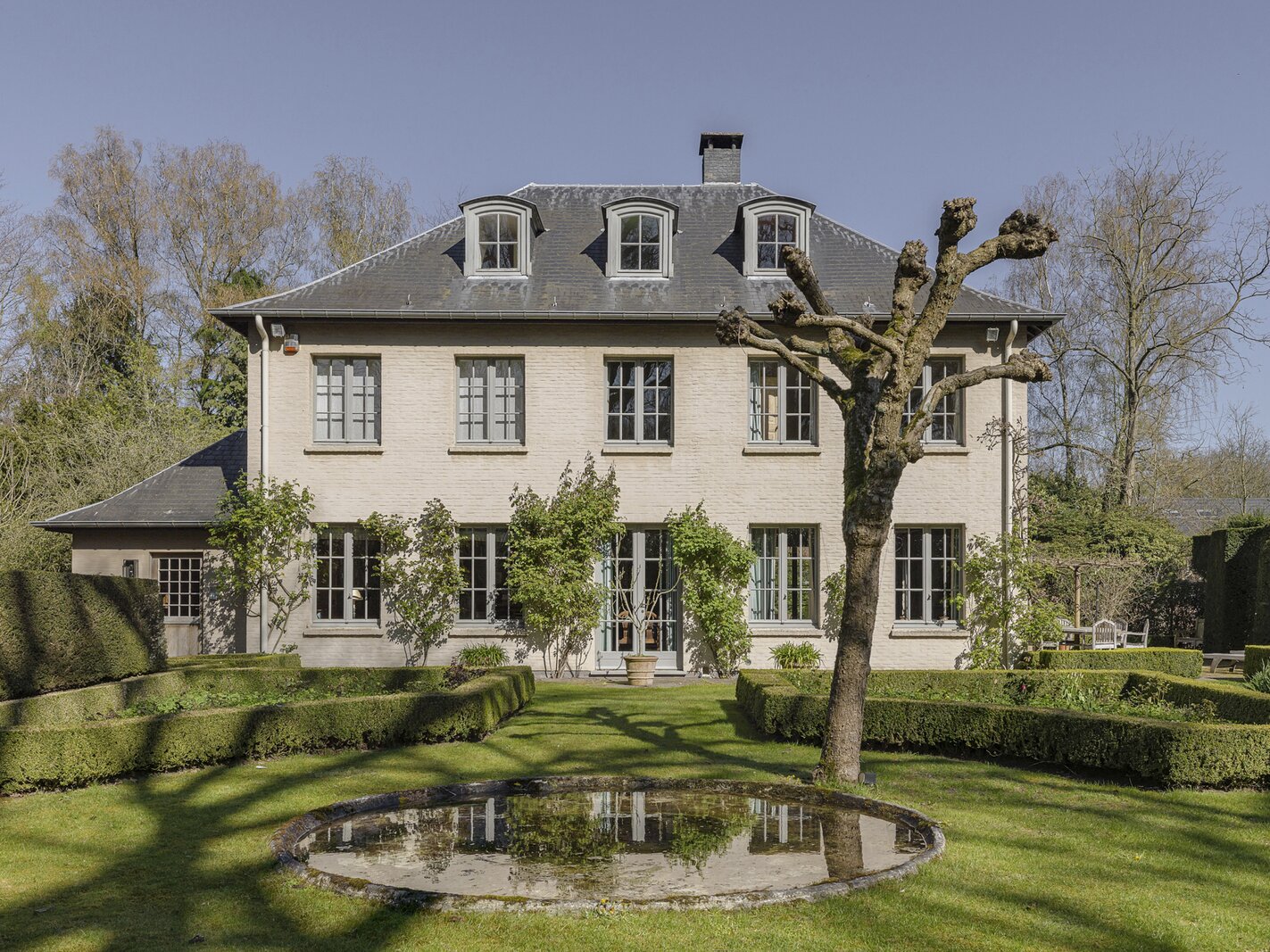 De villa werd zowel interieur als exterieur geverfd met minerale kalkverven. Dak voorzien van natuurleien. Mature tuin met ruime terrassen (Z) op oude kleiklinkers en veel privacy. Frans geïnspireerd met fantastische taxus- en buxusmassieven, een unieke 'blauwe regen' aan de achtergevel, fijne rozen-variëteiten en een 'miroir d'eau' aan de voorzijde.