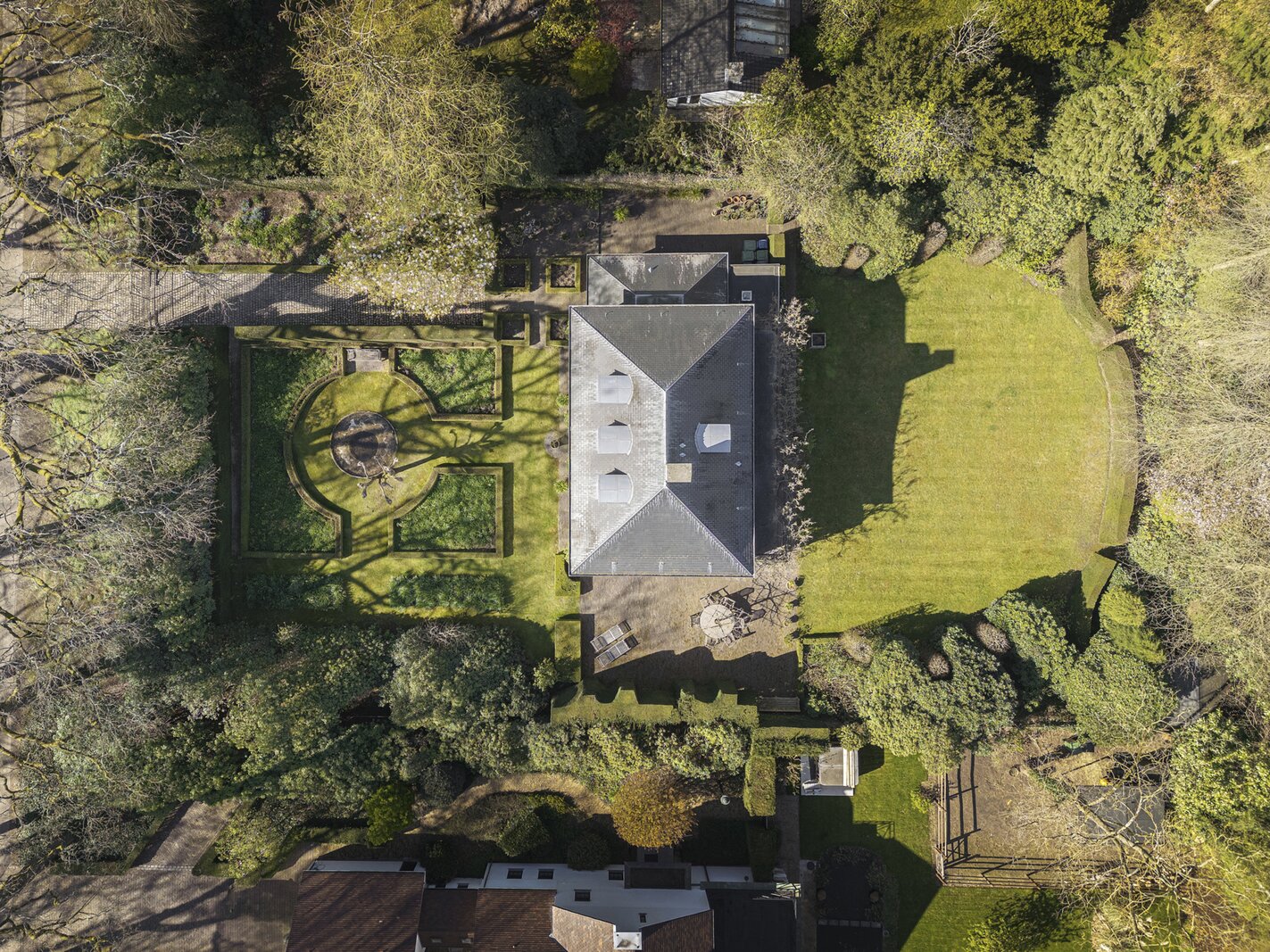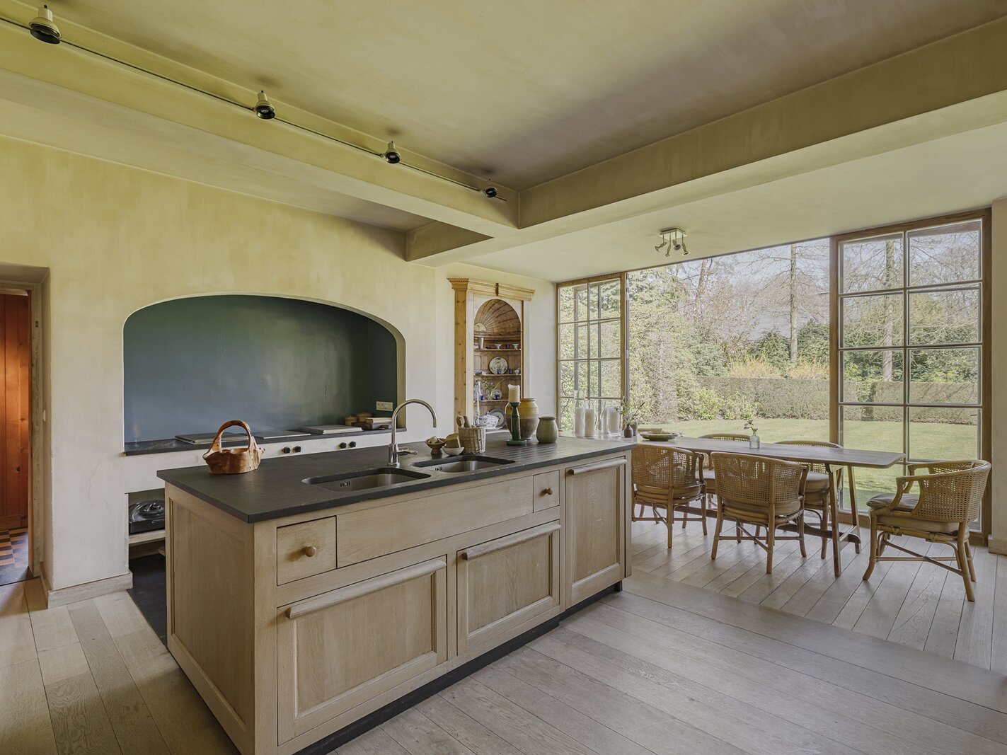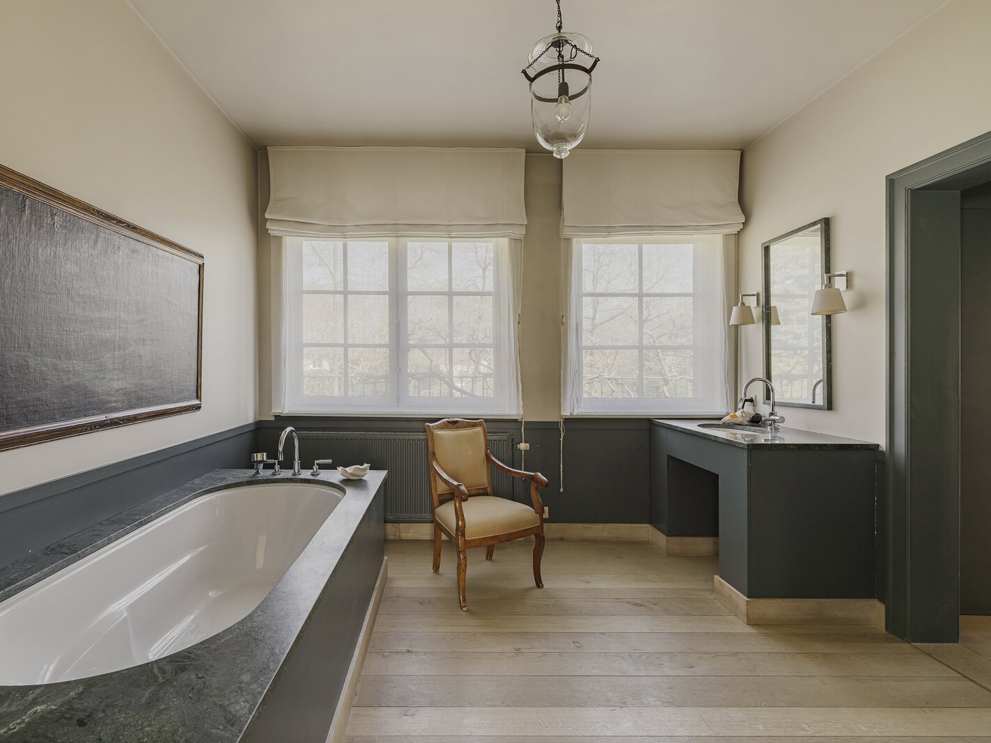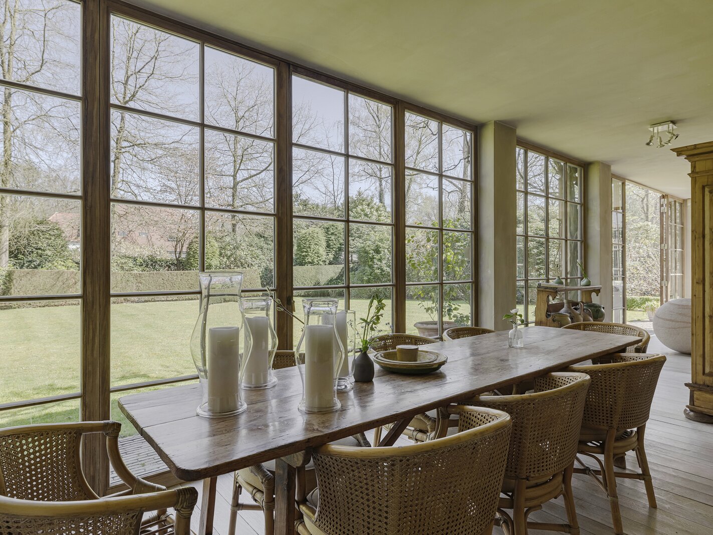 De villa werd zowel interieur als exterieur geverfd met minerale kalkverven. Dak voorzien van natuurleien. Mature tuin met ruime terrassen (Z) op oude kleiklinkers en veel privacy. Frans geïnspireerd met fantastische taxus- en buxusmassieven, een unieke 'blauwe regen' aan de achtergevel, fijne rozen-variëteiten en een 'miroir d'eau' aan de voorzijde.