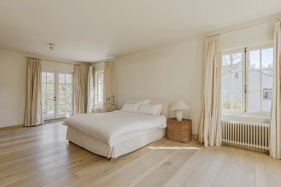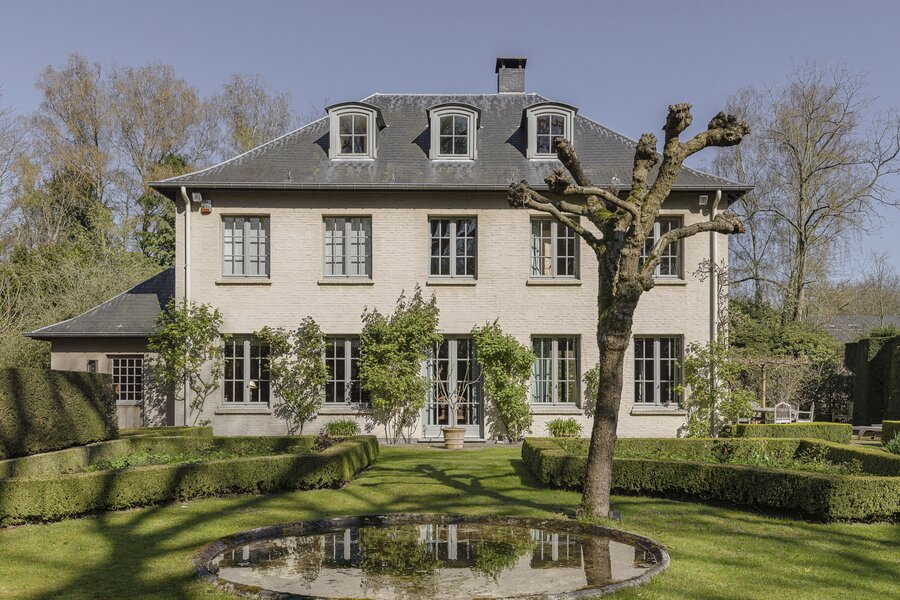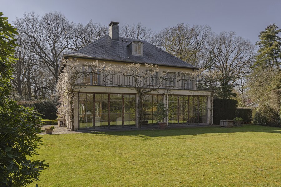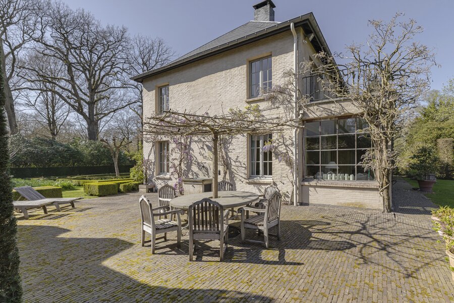 In 2001 werd het pand gerenoveerd waarbij het lijkt alsof het gisteren was... Een statige smeedijzeren inrijpoort kondigt de oprijlaan aan met een prachtige magnolia boom. De inkomhal met boiserie (oude pine) heet u warm welkom met ontvangst in een ruime bibliotheek die multifunctioneel beleefd kan worden. De routing in het huis in combi met de prachtige eiken houten vloeren maken het tot een zeer fijn en leefbaar geheel. Slim ingedeeld, licht en uitermate gezellig. Ruime zitkamer met OH, leef- en bijkeuken en een oranjerie. Grote glaspartijen zorgen voor een maximale tuinbeleving. De eerste verdieping werd opgevat als één grote master suite met een zeer ruime slaapkamer, een badkamer met ligbad en douche in Verde marmer, een dressing met een ruim eiland (topblad in Sainte-Anne) én een wasplaats. De dressing zou omgevormd kunnen worden tot 4de slpk. Op de 2 verdieping bevinden zich nog 2 extra slaapkamers en een afzonderlijke badkamer met douche en toilet. Het interieur is elegant en verfijnd met gebruik van prachtige materialen: Italiaanse en Belgische marmers, originele pitch pine dubbele deuren, gebrande leisteen, unieke haardmoulures...