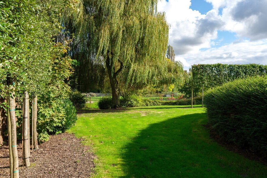 De buitenruimte van de woning is even indrukwekkend. Het perceel, dat bestaat uit twee kavels met een straatbreedte van 40 meter, biedt ruime parkeermogelijkheden en een aangename buitenomgeving. Dankzij de regenwaterput wordt er efficiënt met water omgegaan, wat bijdraagt aan een duurzaam gebruik van de beschikbare middelen.