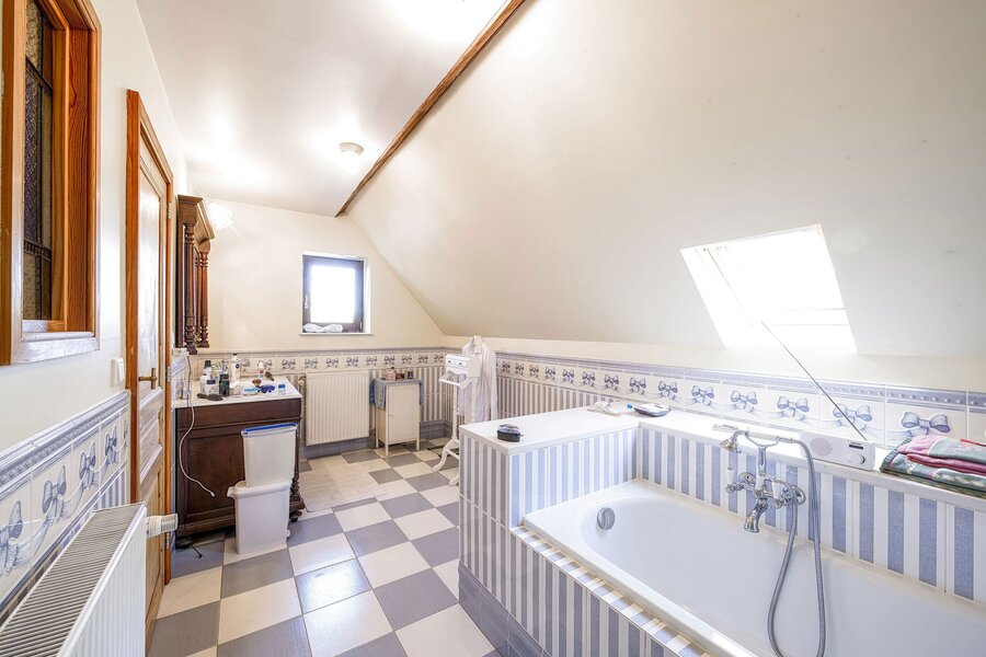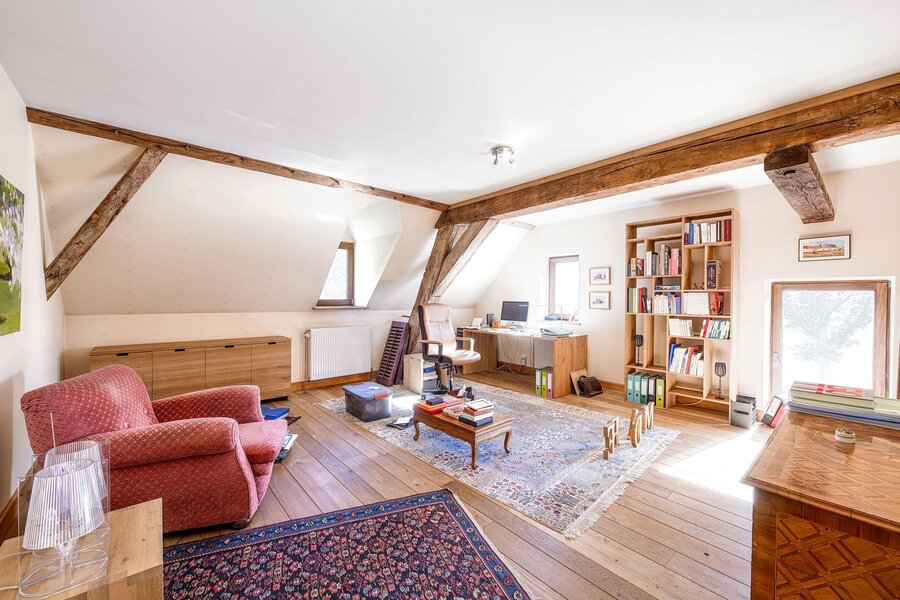 Op de bovenverdieping bestaat de master suite uit een kleedkamer en een badkamer met toilet. Een mooie mezzanine biedt een prachtig uitzicht op de Butte du Lion. Op deze verdieping bevinden zich ook vier extra slaapkamers, een badkamer met douche, een tweede badkamer met toilet en een apart toilet.