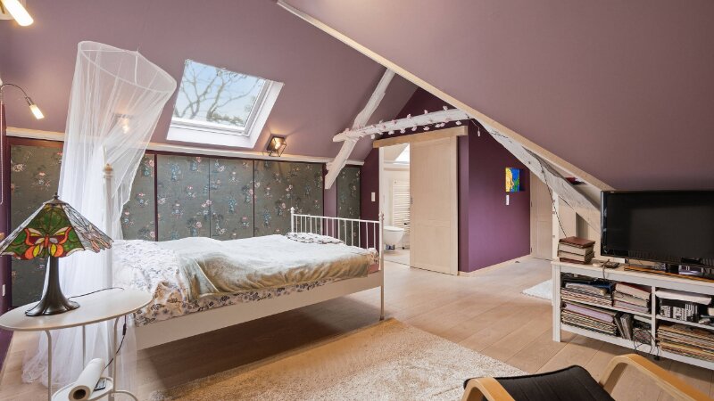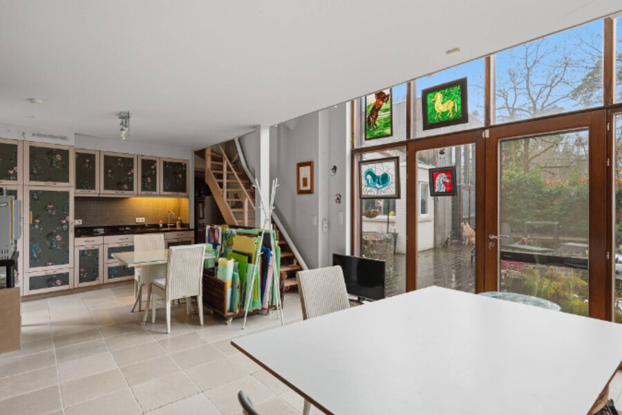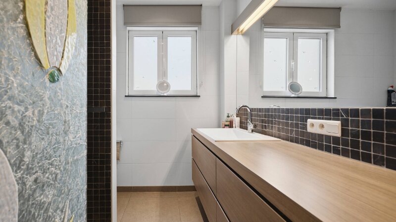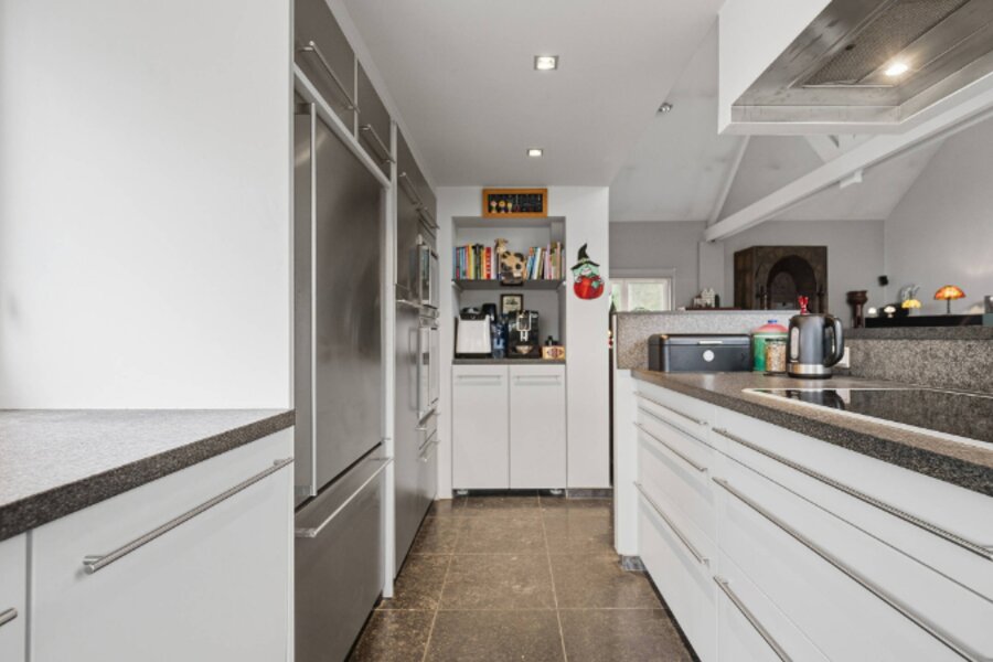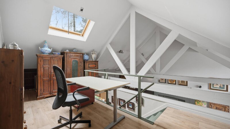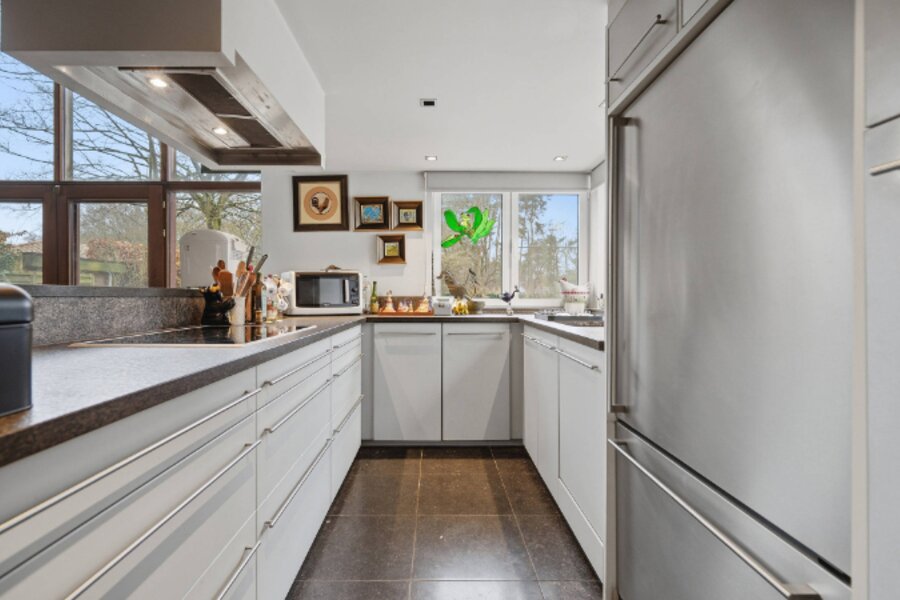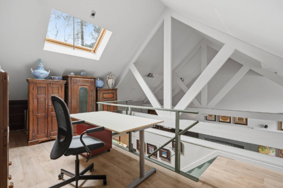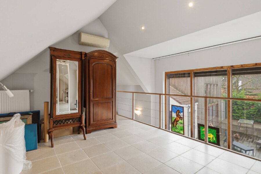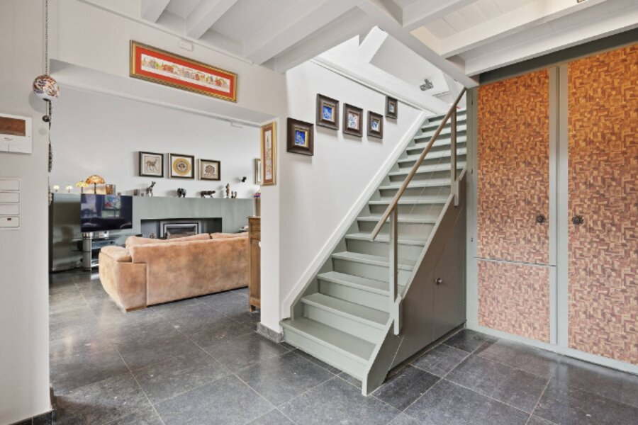 Omvat: inkomhal, ruime living van 64m² met open ingerichte keuken, 2e living met kitchenette (38m²) of eventueel dienstig als bureelruimte/praktijkruimte of kangoeroewoning, berging, cv-ruimte, 3 slaapkamers, 3 bad/douchekamers en bureelhoek op mezzanine. Totale vloeroppervlakte: 269m².