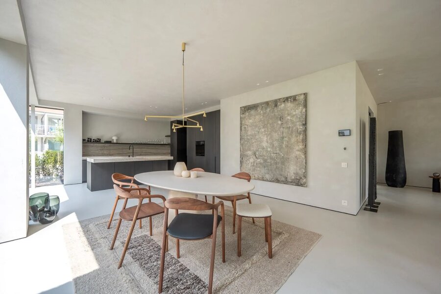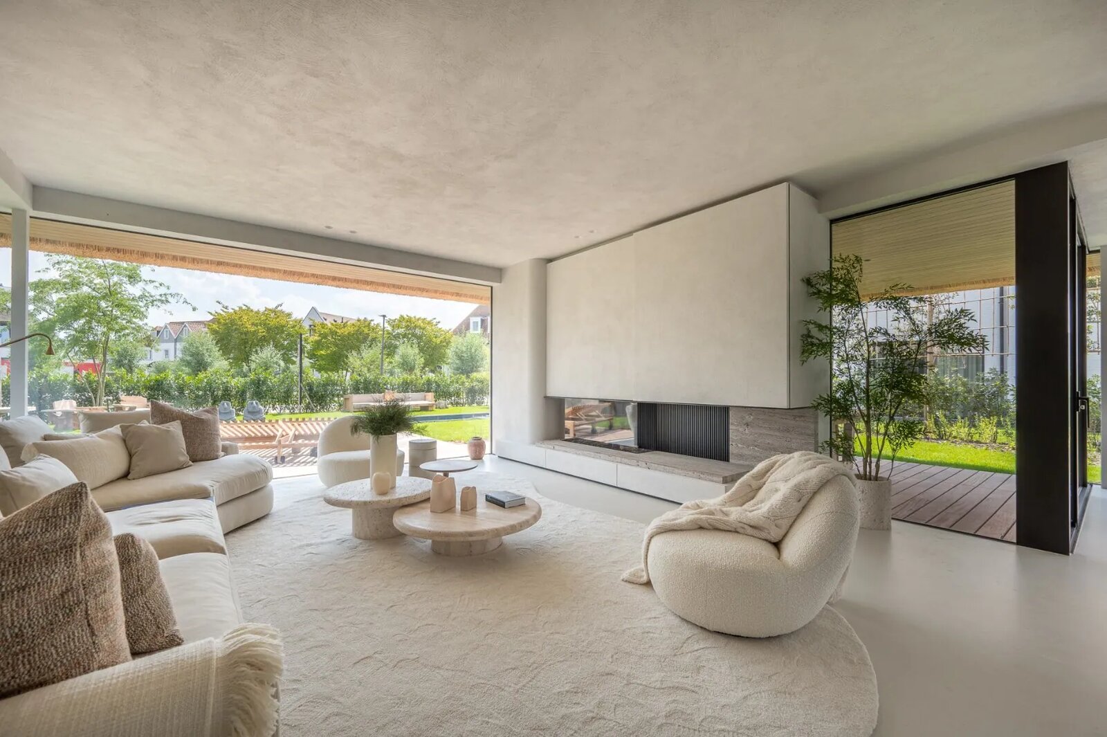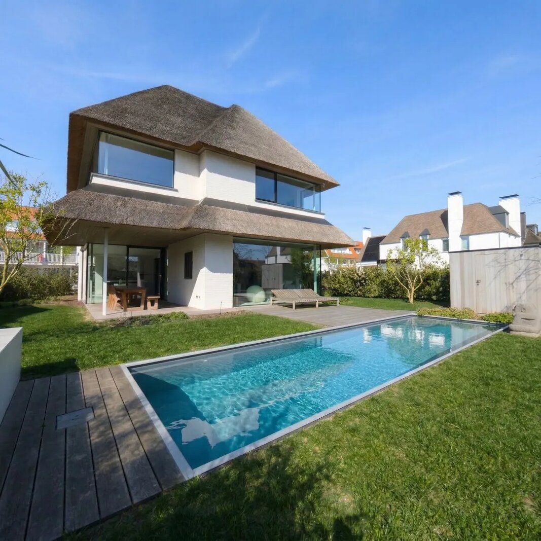 Ruime en lichtrijke leefruimte met grote raampartijen met minimal windows uitgevend op een overdekt terras en tuin. De tuin beschikt over een zwembad (8m00 op 2m50) en wordt verwarmd door een warmtepomp.