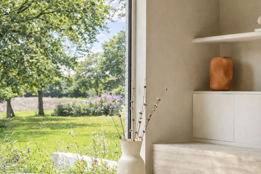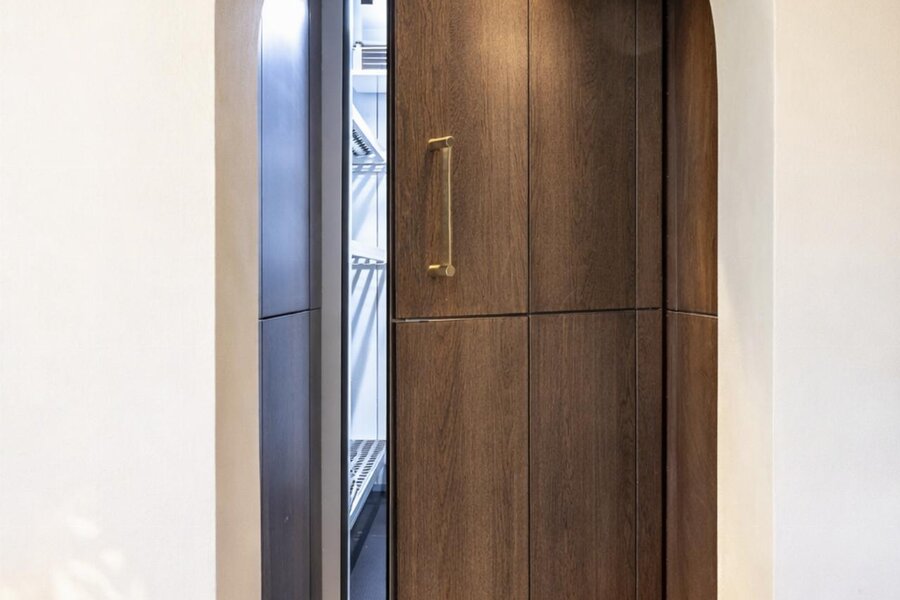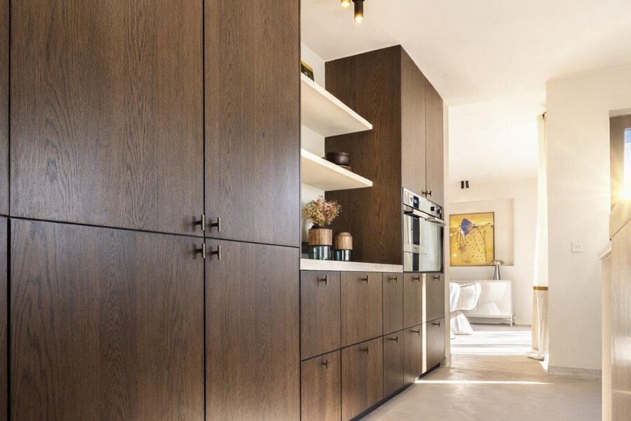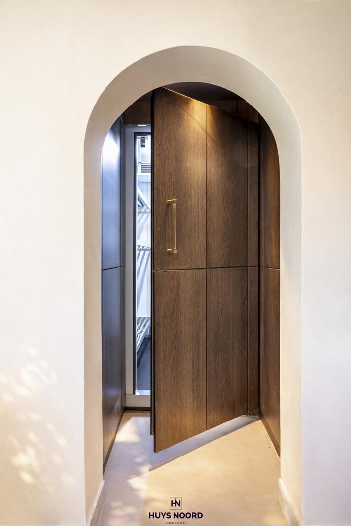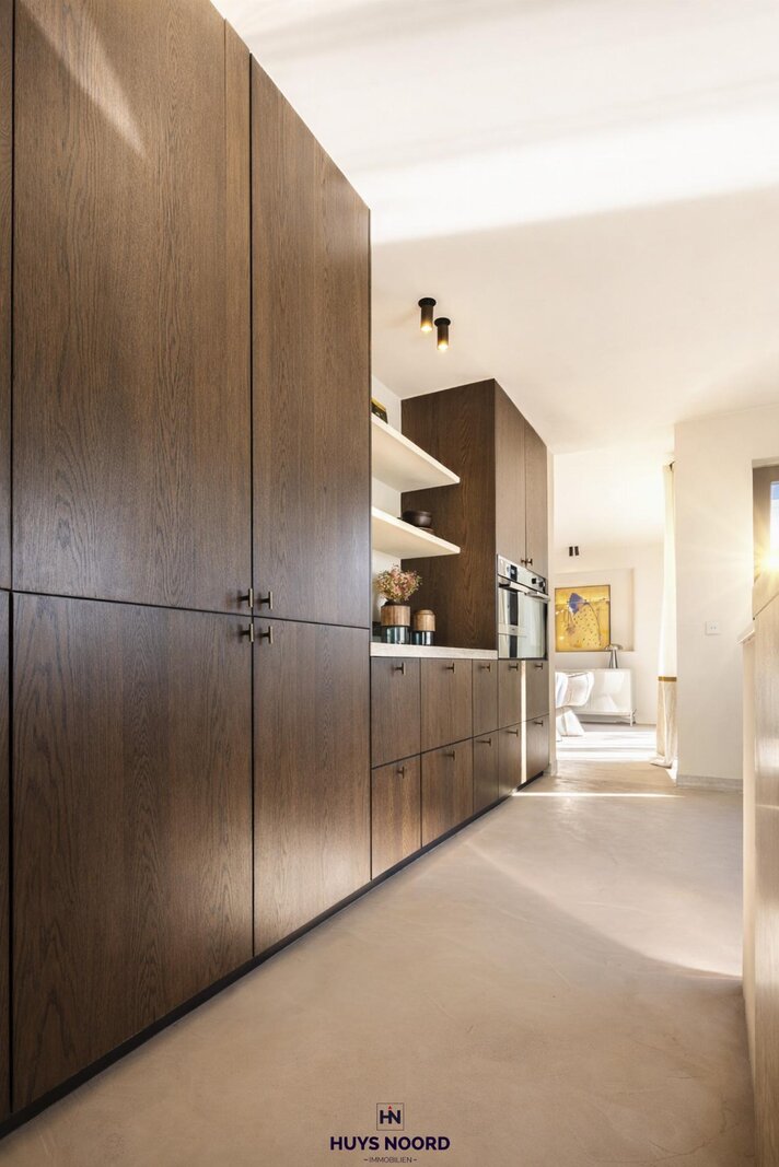 De naadloos geïntegreerde vlakke deuren en stijlvolle stalen binnendeuren versterken het charmante karakter, terwijl de exclusieve maatkeuken uitblinkt met een koelcel en hoogwaardige Miele-toestellen.