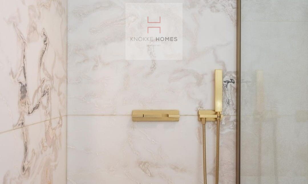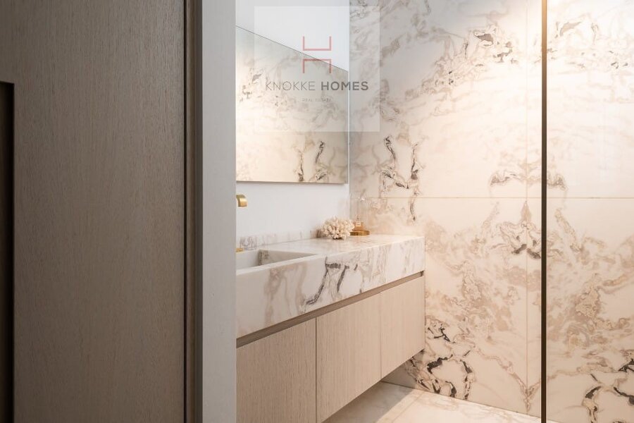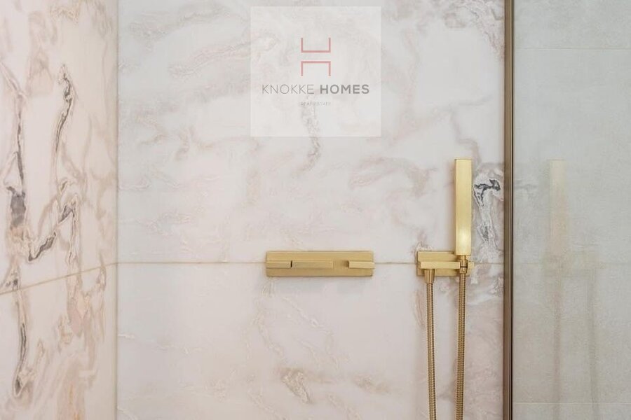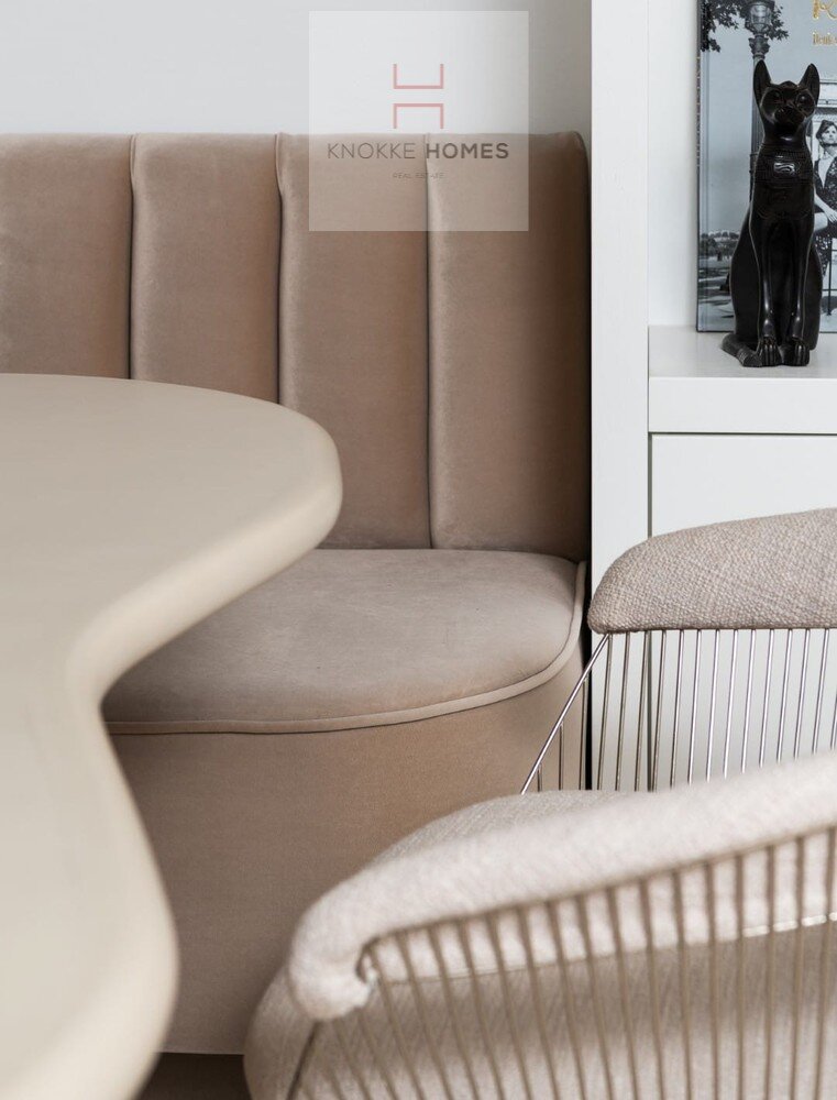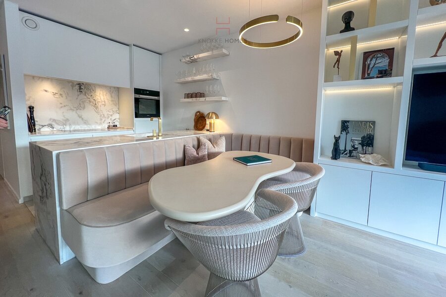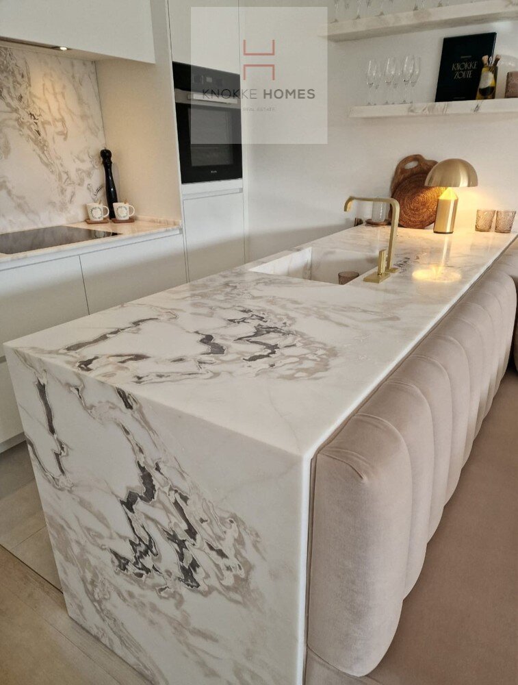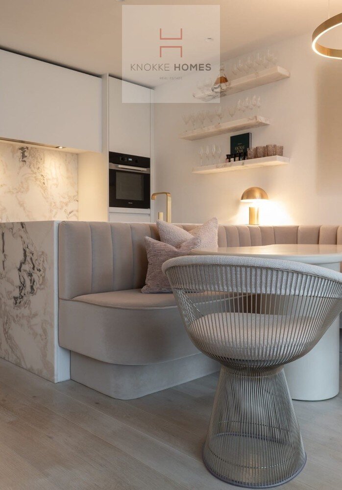 Het appartement geniet van een ruime, lichtrijke leefruimte met grote raampartijen en een volledig glazen balustrade, waardoor het open zicht maximaal wordt benut. De leefruimte sluit naadloos aan op het zuidgericht terras, dat de hele dag door zon biedt. De eetruimte grenst aan de luxueus uitgewerkte open keuken, gerealiseerd in exclusief wit/Oyster white marmer met hoogkwalitatieve Miele-toestellen.