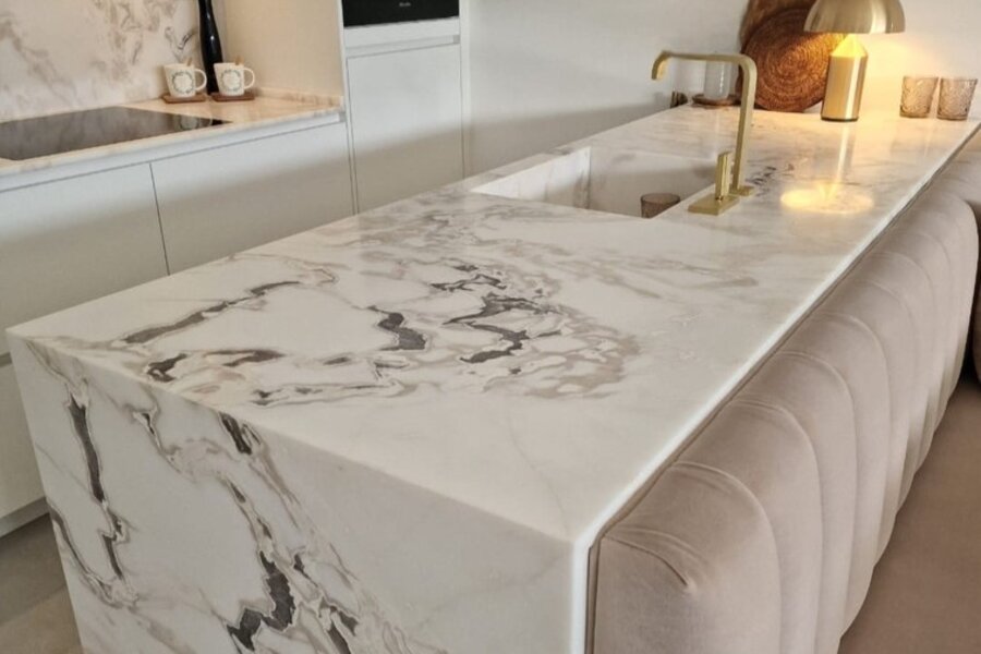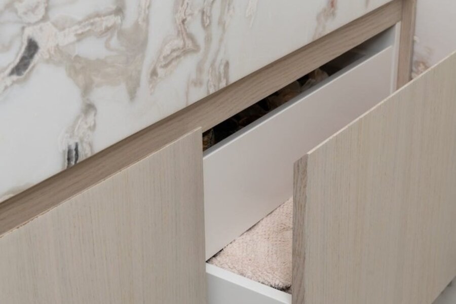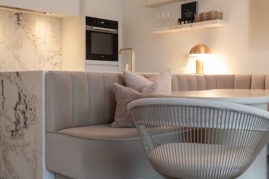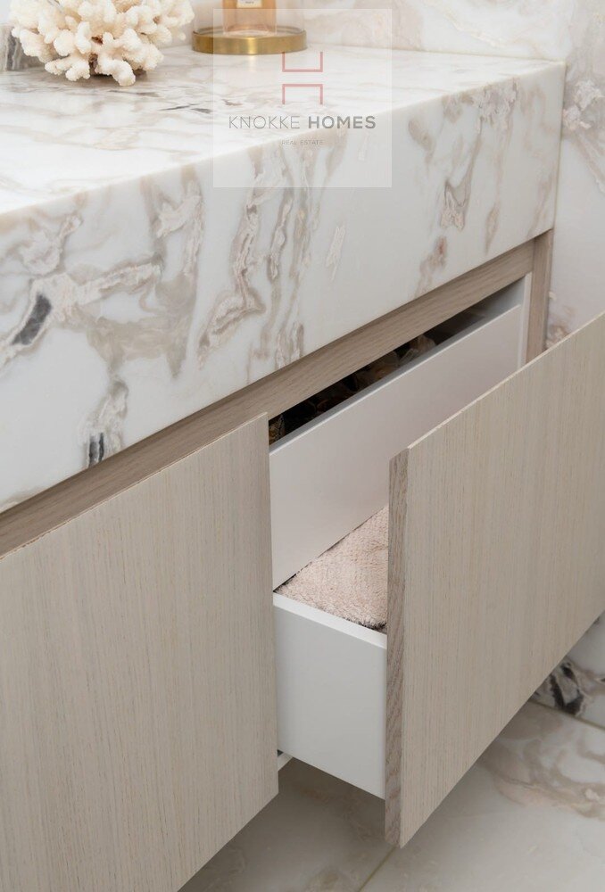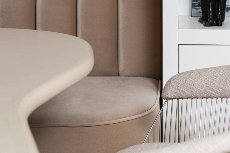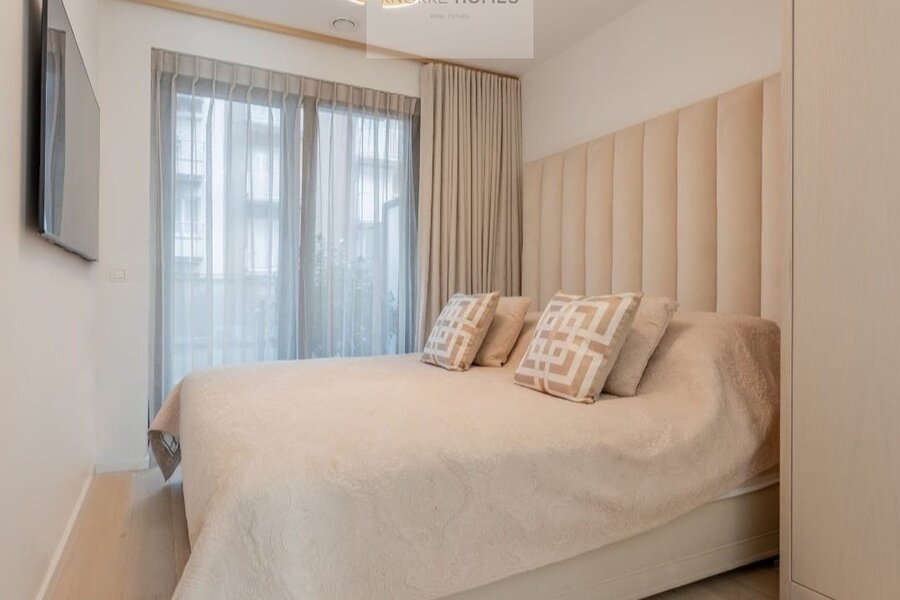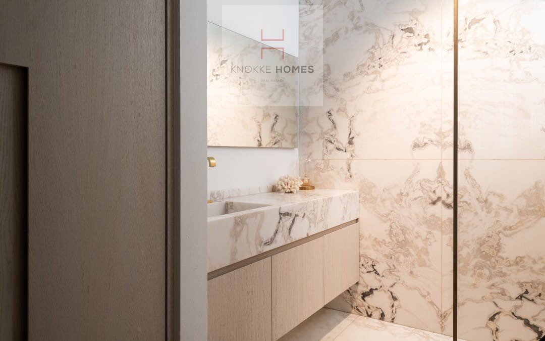 Het appartement geniet van een ruime, lichtrijke leefruimte met grote raampartijen en een volledig glazen balustrade, waardoor het open zicht maximaal wordt benut. De leefruimte sluit naadloos aan op het zuidgericht terras, dat de hele dag door zon biedt. De eetruimte grenst aan de luxueus uitgewerkte open keuken, gerealiseerd in exclusief wit/Oyster white marmer met hoogkwalitatieve Miele-toestellen.