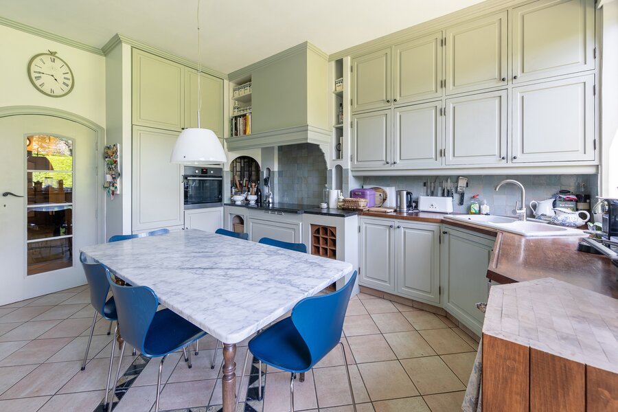 Gourmet, volledig uitgeruste keuken ± 20,5m² met een eettafel die naar buiten opent