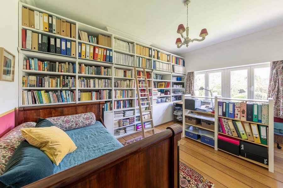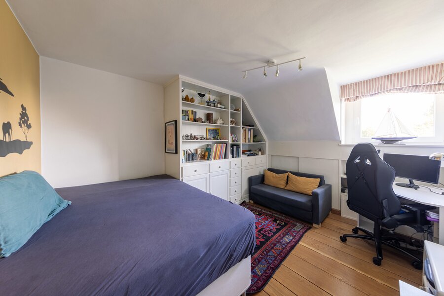 Slaapkamer 2 ± 23,5m² met doucheruimte, parketvloer, bibliotheek