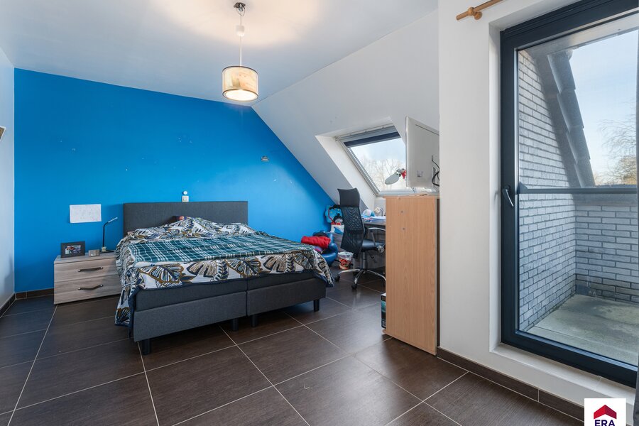 Tweede verdiep: 3 slaapkamers van resp. 20m², 23m², 25m². Badkamer met bad, dubbel lavabomeubel, toilet en voorziening voor dubbele douche. Eén van de slaapkamers heeft zijn eigen ensuite badkamer met douche en lavabo. Terras voor en achteraan.