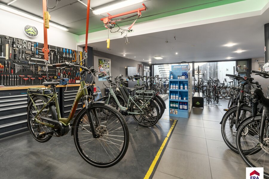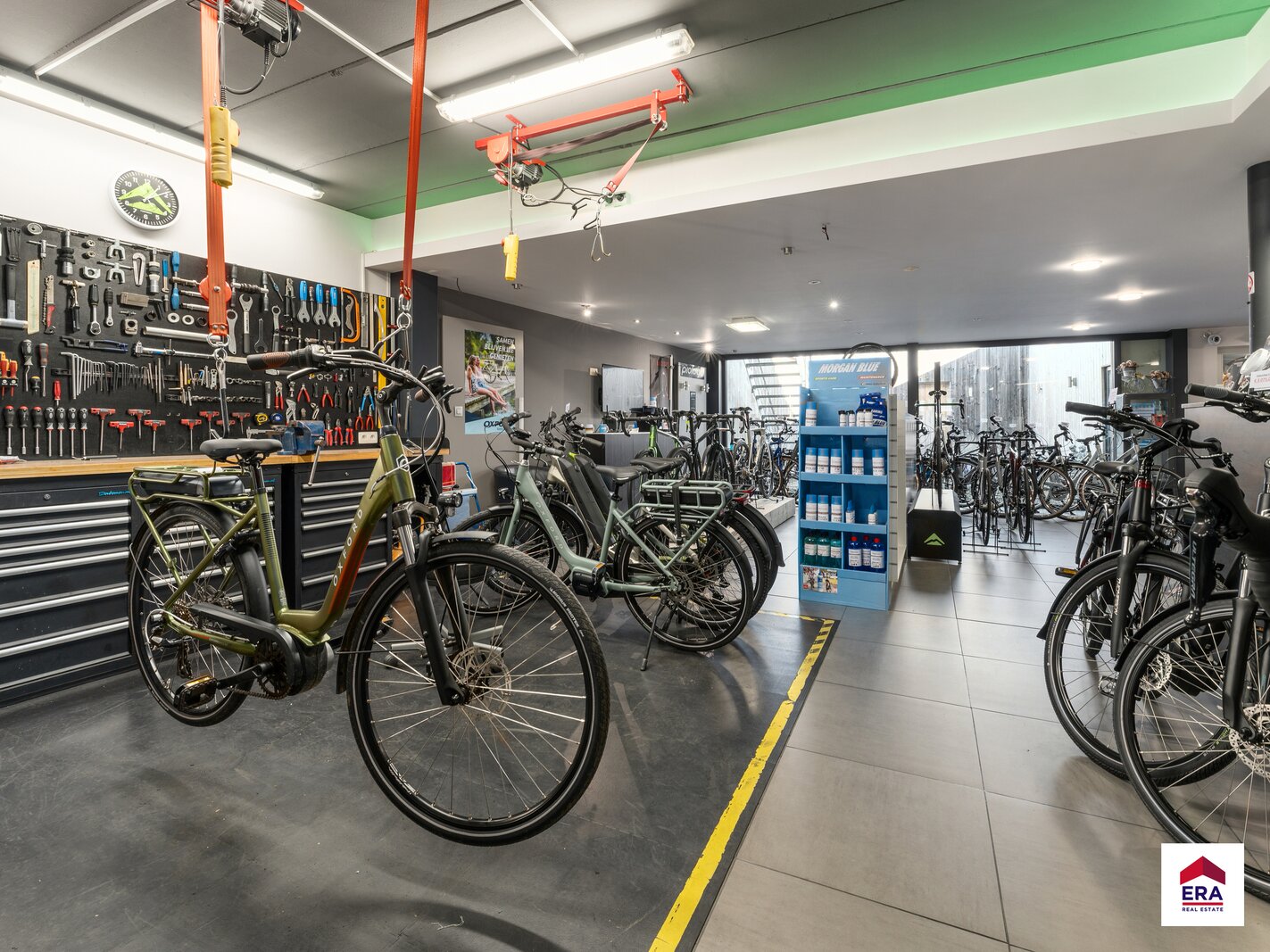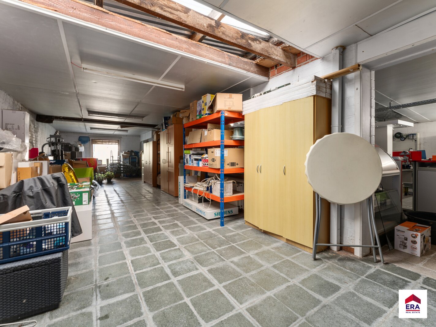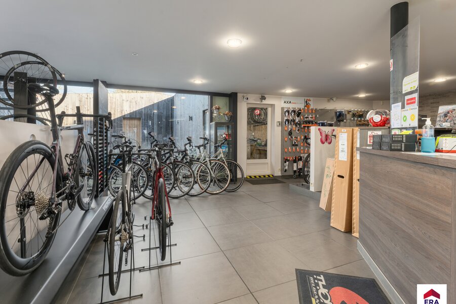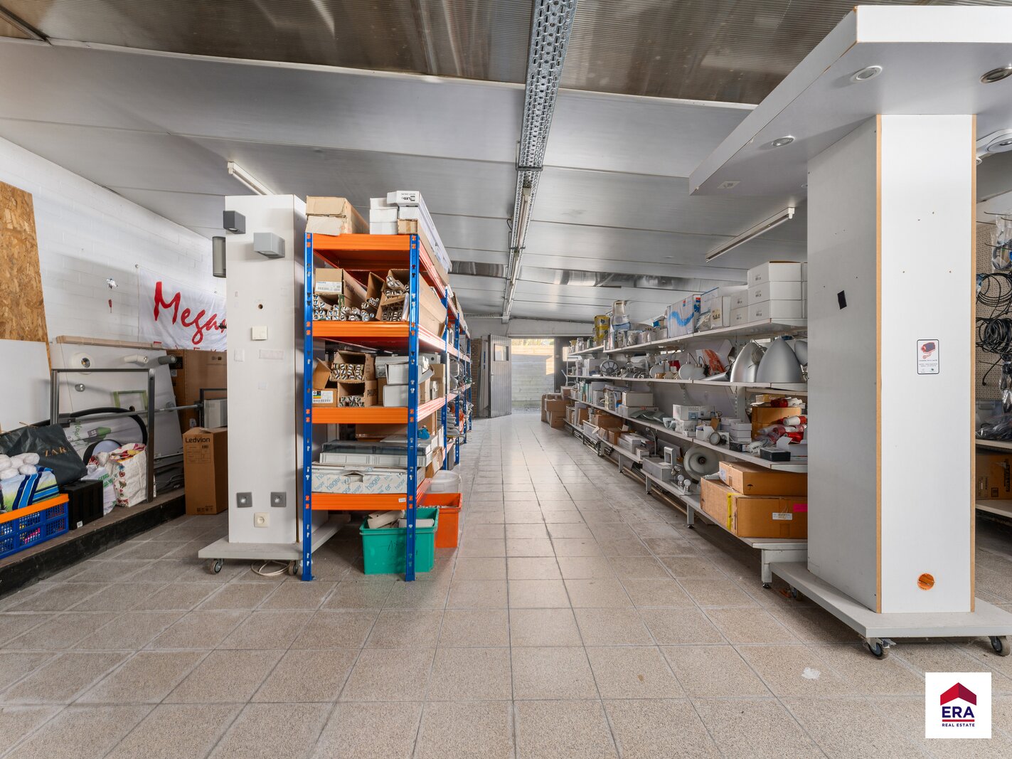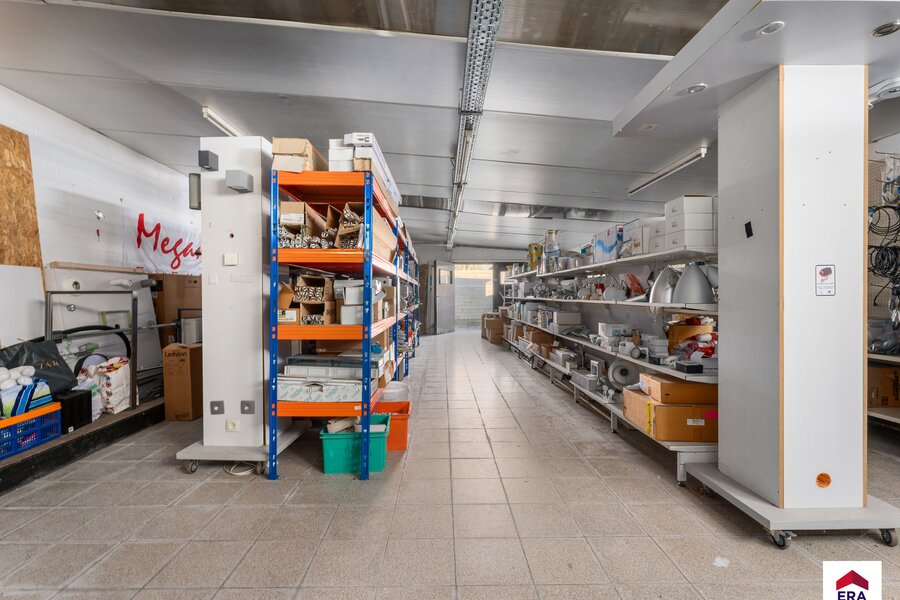 Commerciële/ polyvalente ruimte van +/- 150m² met berging en apart toilet. Achterliggend magazijn van 198m².