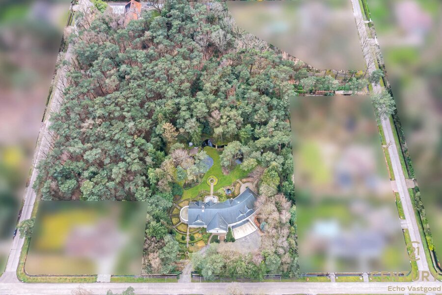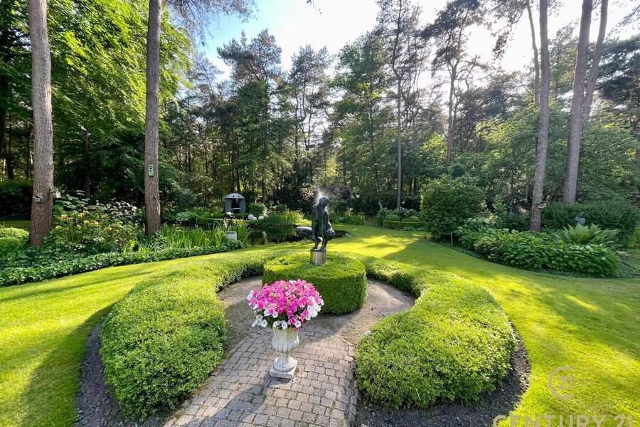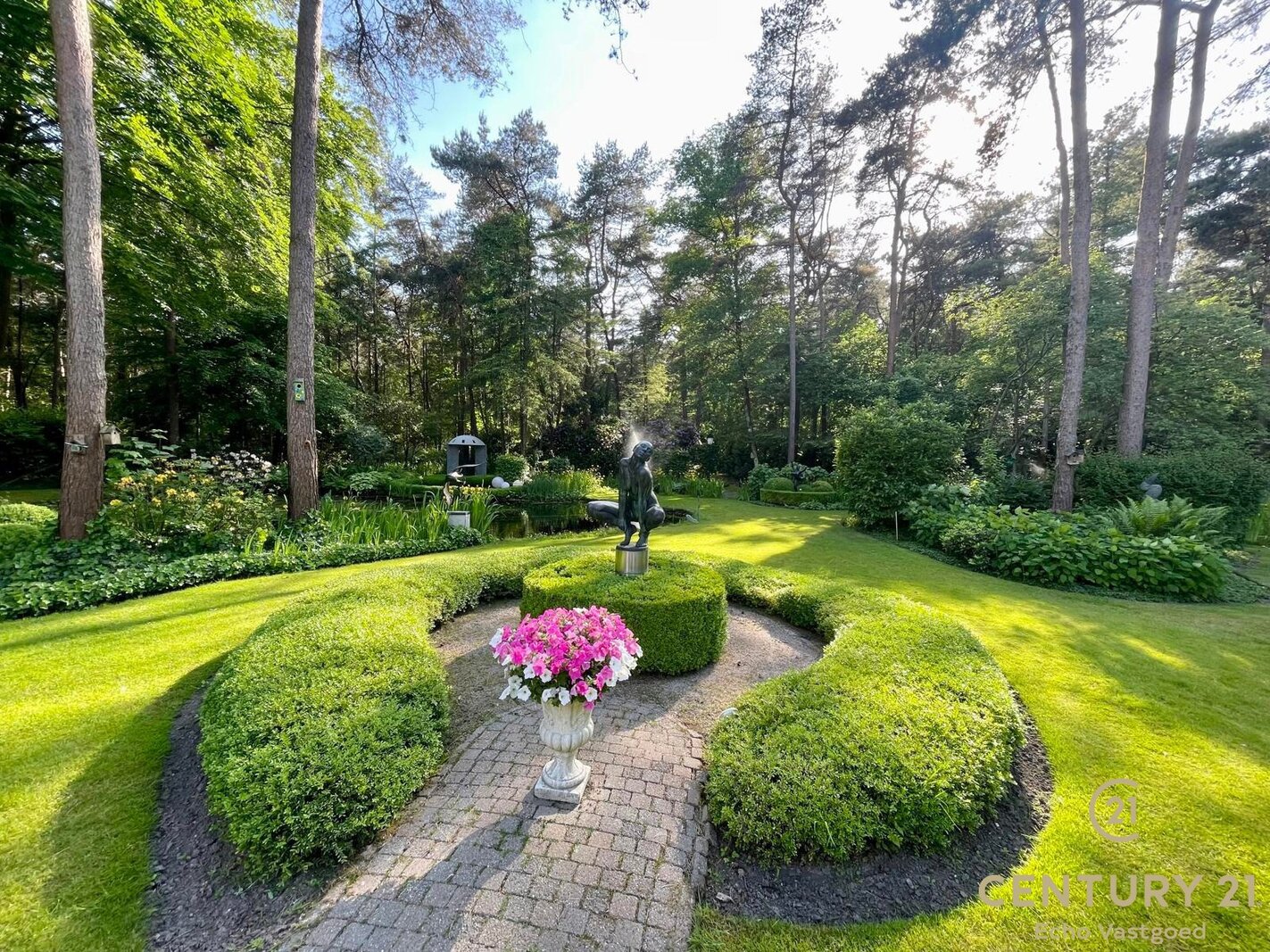 De uitzonderlijk mooie tuin werd onder architectuur aangelegd, eerste 5000m2 rondom en achter de woning is als siertuin aangelegd, met ruime voorziening van beplanting, achterliggend bevindt zich een bos met een inrit vanuit de naastliggende straat. De tuin zelf is voorzien van een beregeningsinstallatie, tuinverlichting en vijverpartij met zuiveringscirculatie.