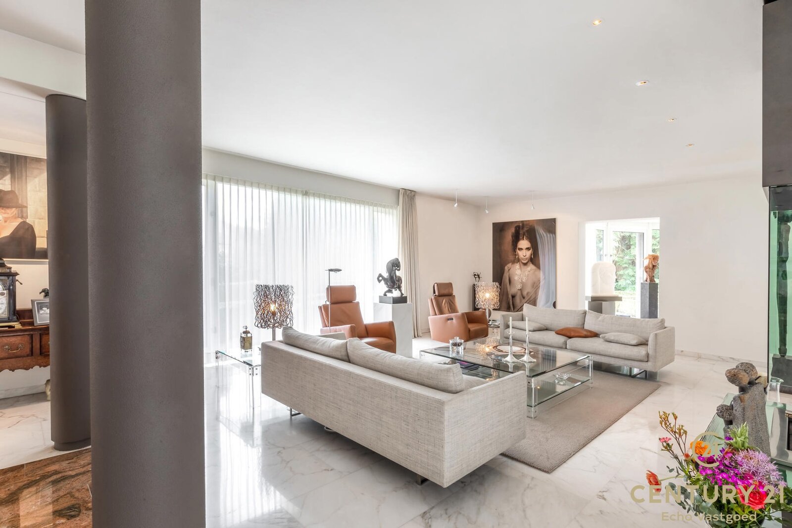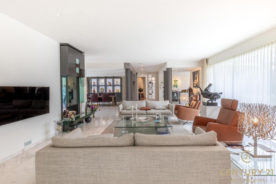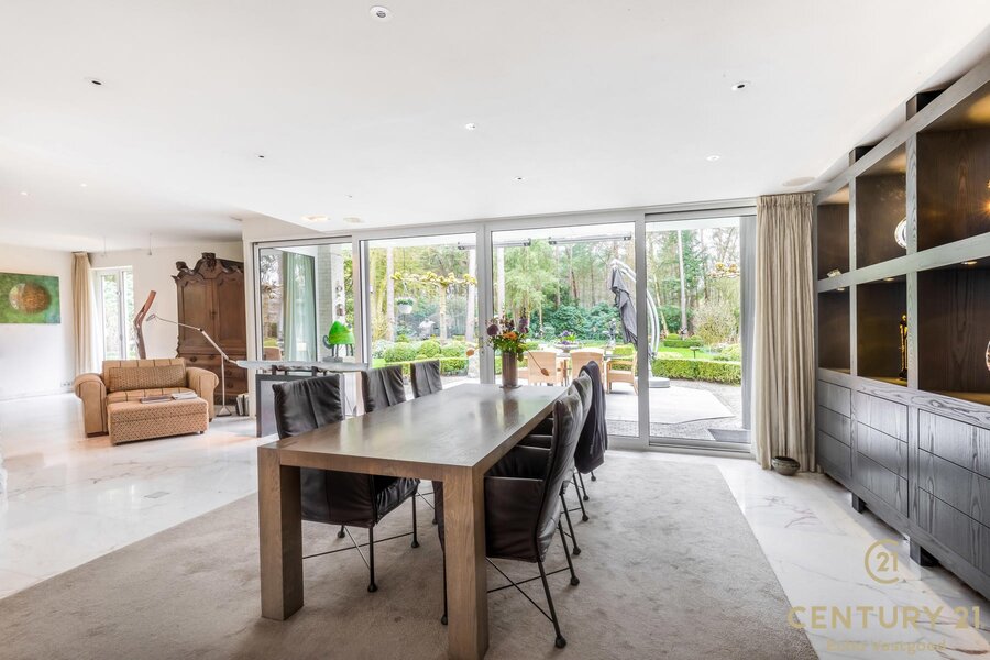 De leefruimte bestaat uit verschillende gedeelten die knus zijn, in contact staan met elkaar en uitkijken op de zuid-westgerichte aangelegde tuin in volle privacy. Zo vinden we links de studiehoek terug met een ruim bureel, geïntegreerd in het geheel. Verder is er een zit- en tv/hoek afgescheiden met een gezamenlijke gashaard met aansluitend nog een tuinkamer. Verder vinden we een mooie ruime dining room terug, met dubbele deuren naar het terras.