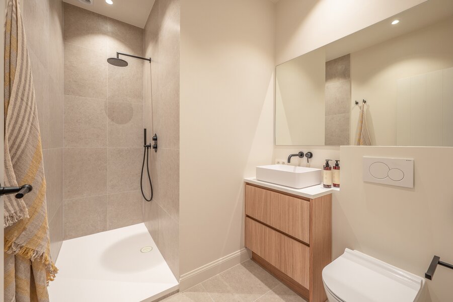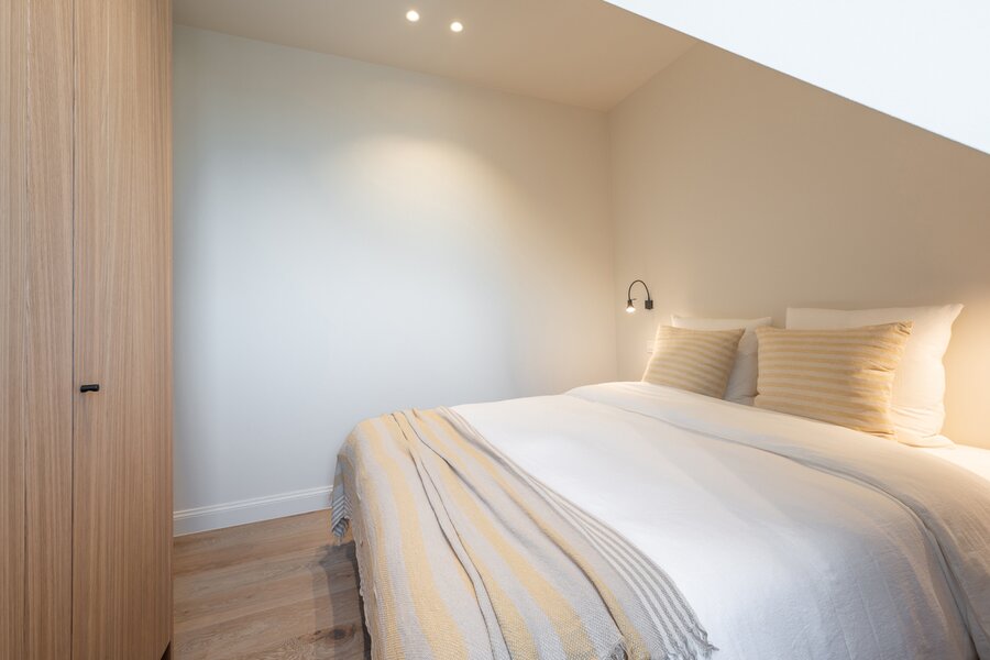 Volledig uitgeruste, open keuken. Op de bovenverdieping bevinden zich twee masterbedrooms elk uitgerust met ingemaakte kasten. Doucheruimte.
