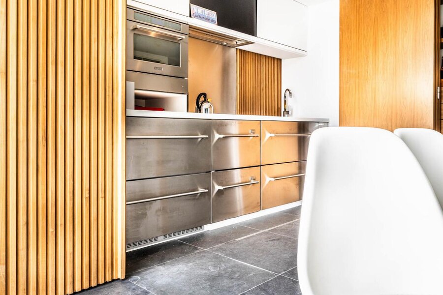 De houten accentwand/deur laat u bovendien toe een neutrale sfeer te creëren waarbij uw open keuken verdwijnt in het geheel.