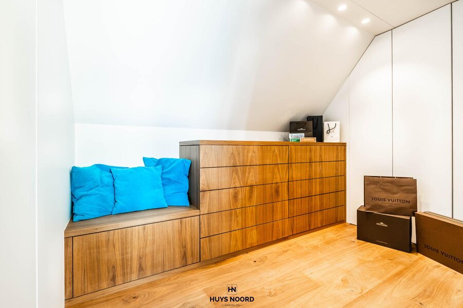 Het eerste verdiep, op een parketvloer, geniet de ruime Master-bedroom met aangrenzend de smaakvol ingerichte dressing.