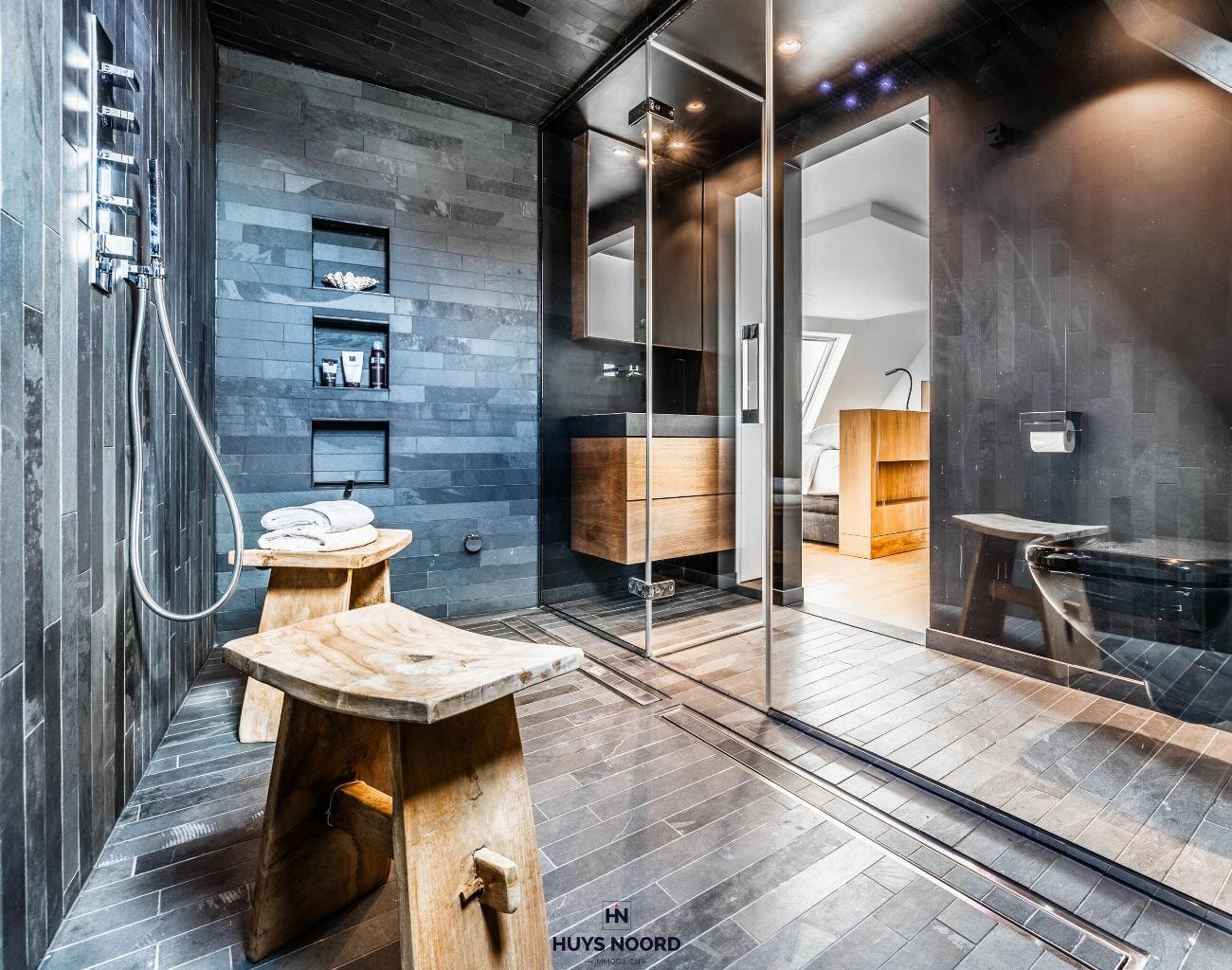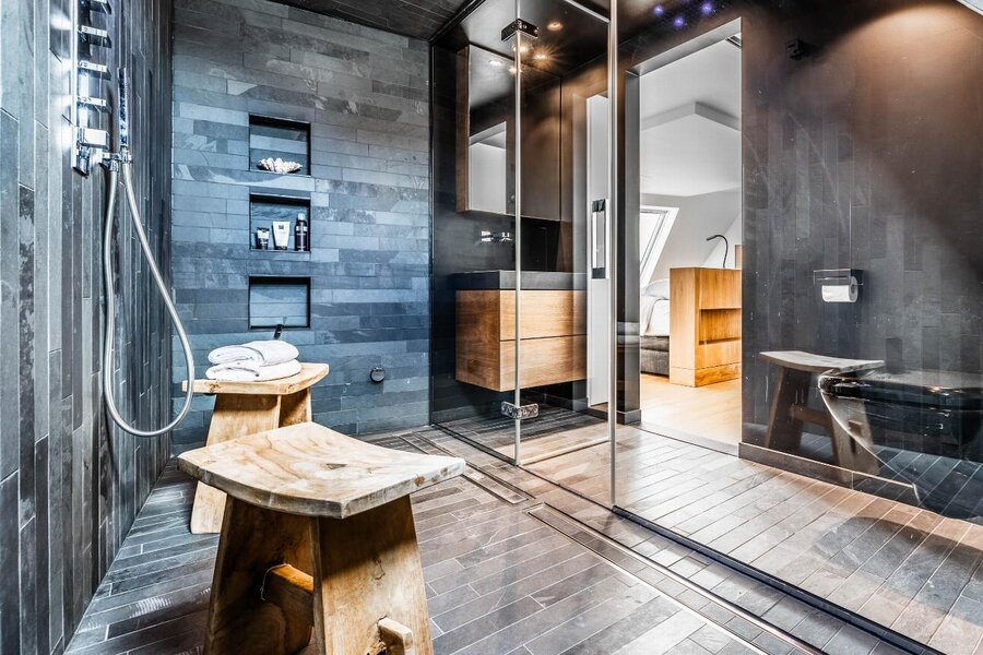 De ruime badkamer werd tot in de kleinste details afgewerkt met design wand- en vloerbetegeling, wastafelmeubel, toilet en inloop regendouche met Hammam/Stoomcabine functies.