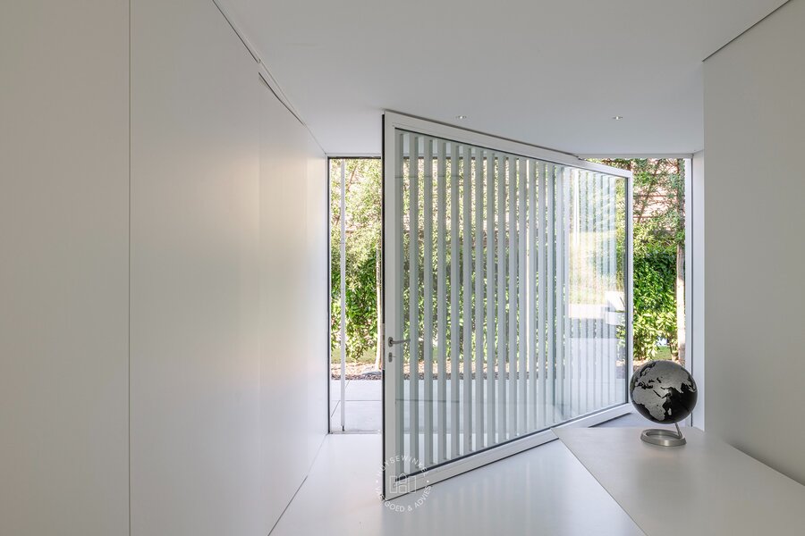 Bij het betreden van de villa wordt u verwelkomd door een unieke pivoterende deur die toegang geeft tot de inkomhal, momenteel in gebruik als bureauruimte. Aan de linkerzijde bevindt zich een driedubbele inpandige garage en aan de rechterzijde de woonvertrekken. De moderne open keuken is volledig uitgerust en sluit aan op een lichte leefruimte. De grote raampartijen zorgen voor een adembenemend zicht op het zwembad en de tuin die overvloeit in de achterliggende landerijen.