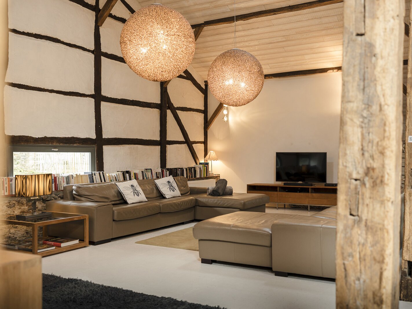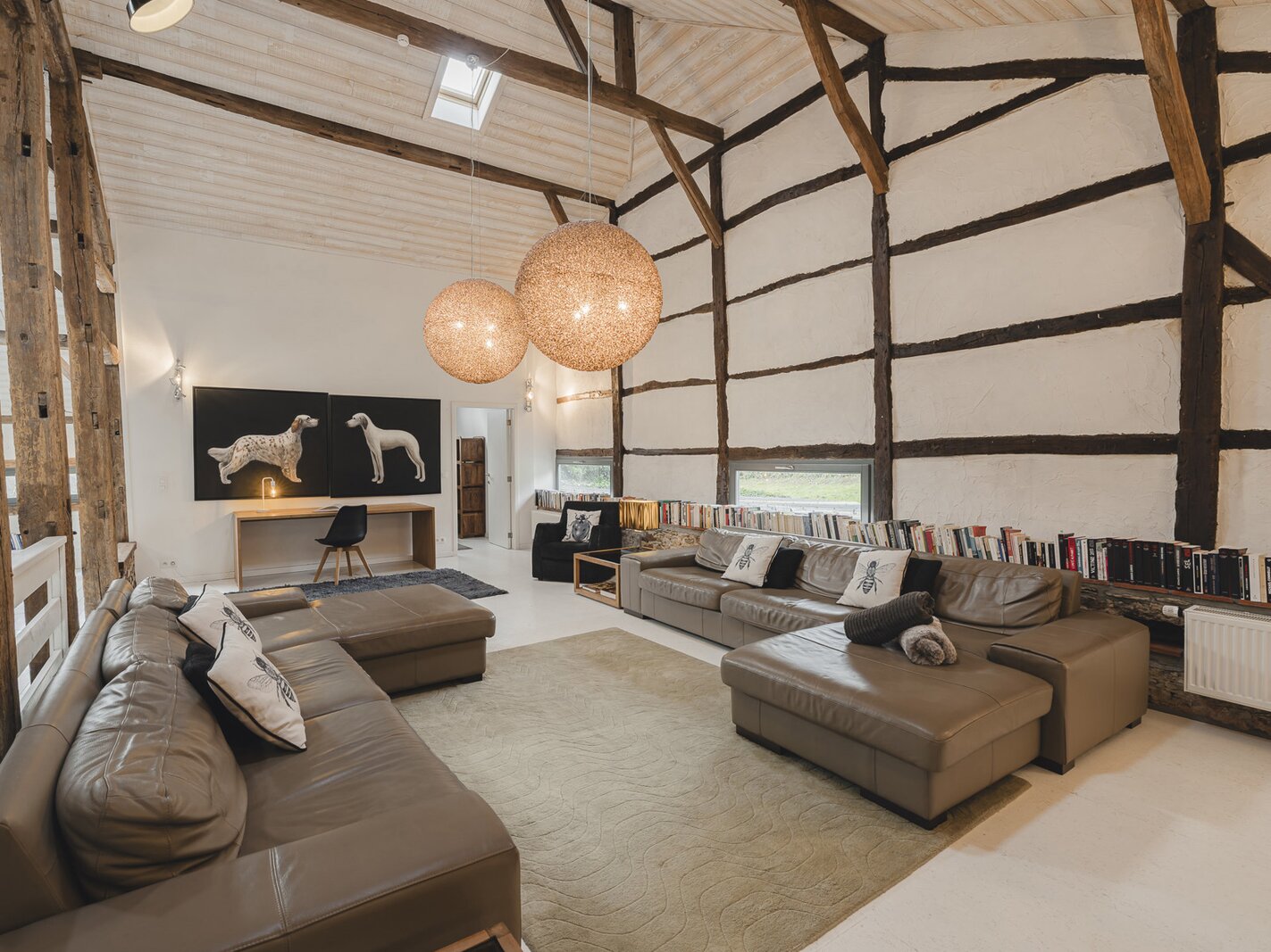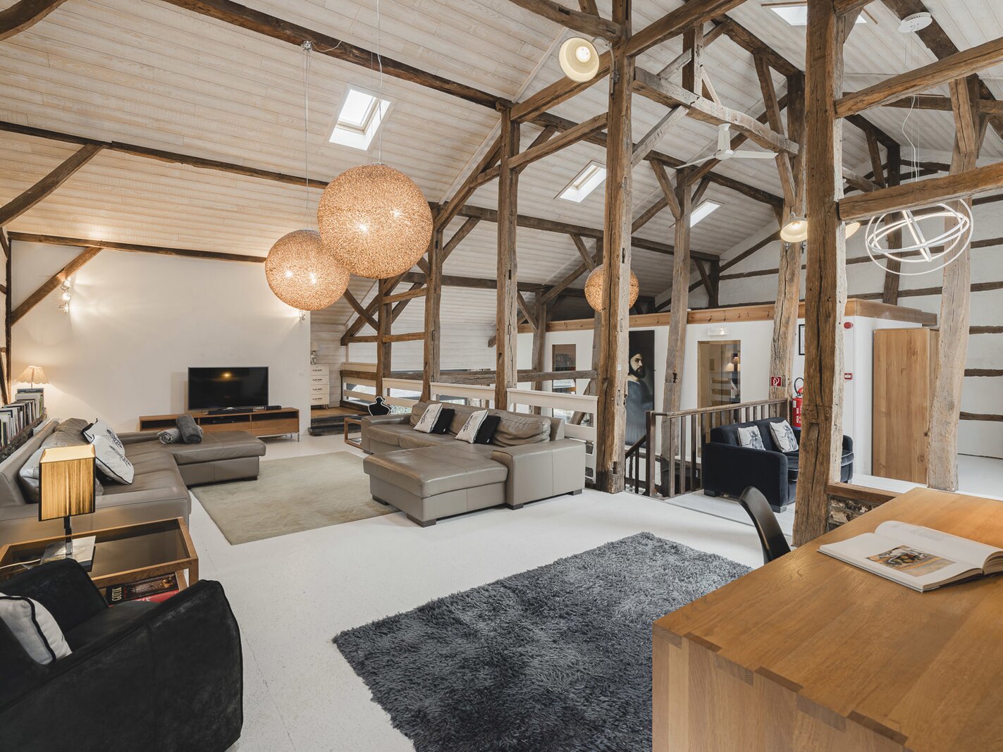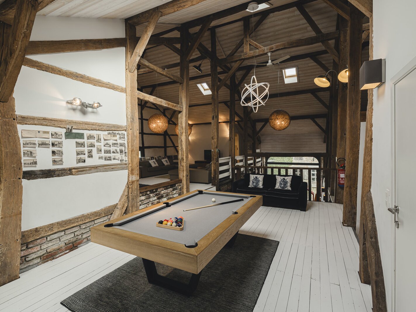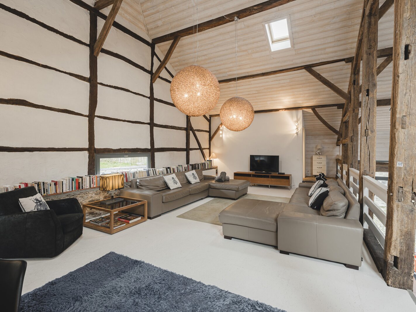 een grote raamkozijn dat veel natuurlijk licht binnenlaat. De gerenoveerde voormalige schuur heeft zijn originele balkenplafond en prachtige hoge plafonds behouden. De mezzanine leidt naar een leefruimte met een ruime zitkamer, een speelkamer met biljart, WC, 3 slaapkamers en 2 badkamers. Het tweede deel heeft 4 ruime slaapkamers en 2 badkamers.