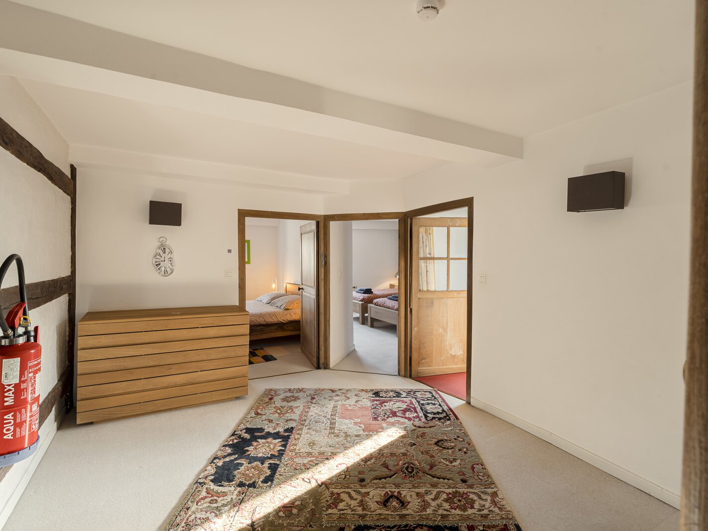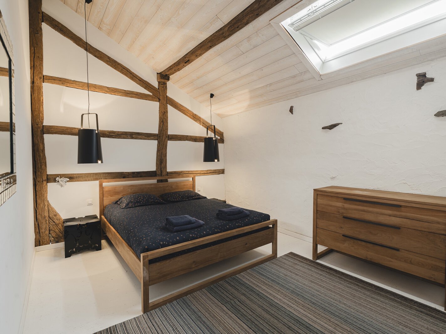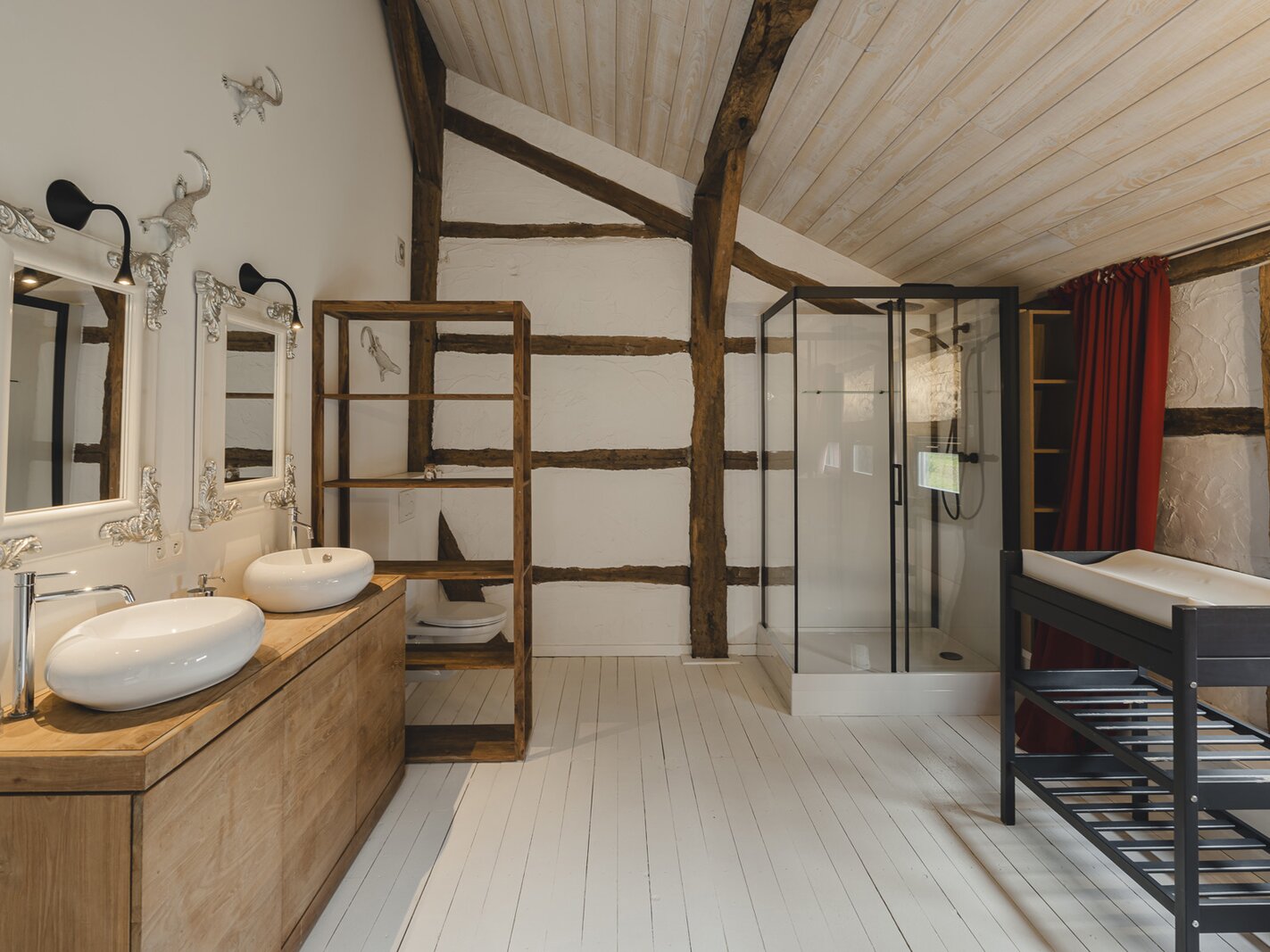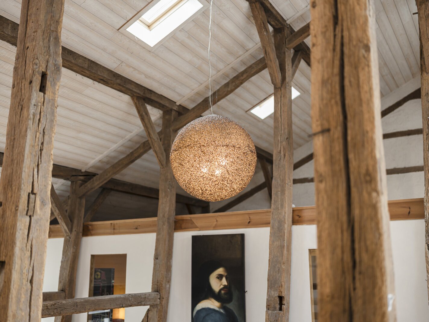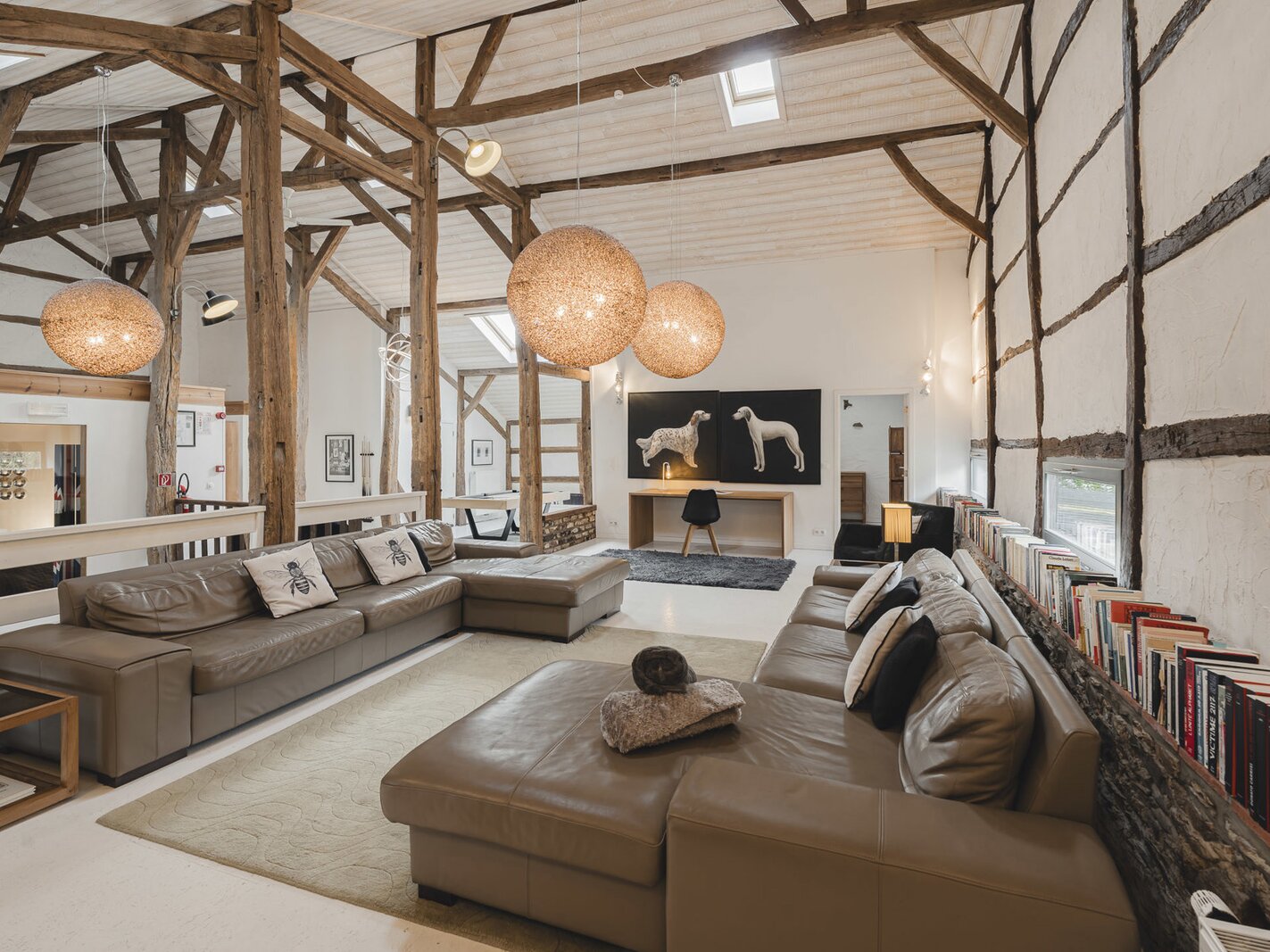 een grote raamkozijn dat veel natuurlijk licht binnenlaat. De gerenoveerde voormalige schuur heeft zijn originele balkenplafond en prachtige hoge plafonds behouden. De mezzanine leidt naar een leefruimte met een ruime zitkamer, een speelkamer met biljart, WC, 3 slaapkamers en 2 badkamers. Het tweede deel heeft 4 ruime slaapkamers en 2 badkamers.