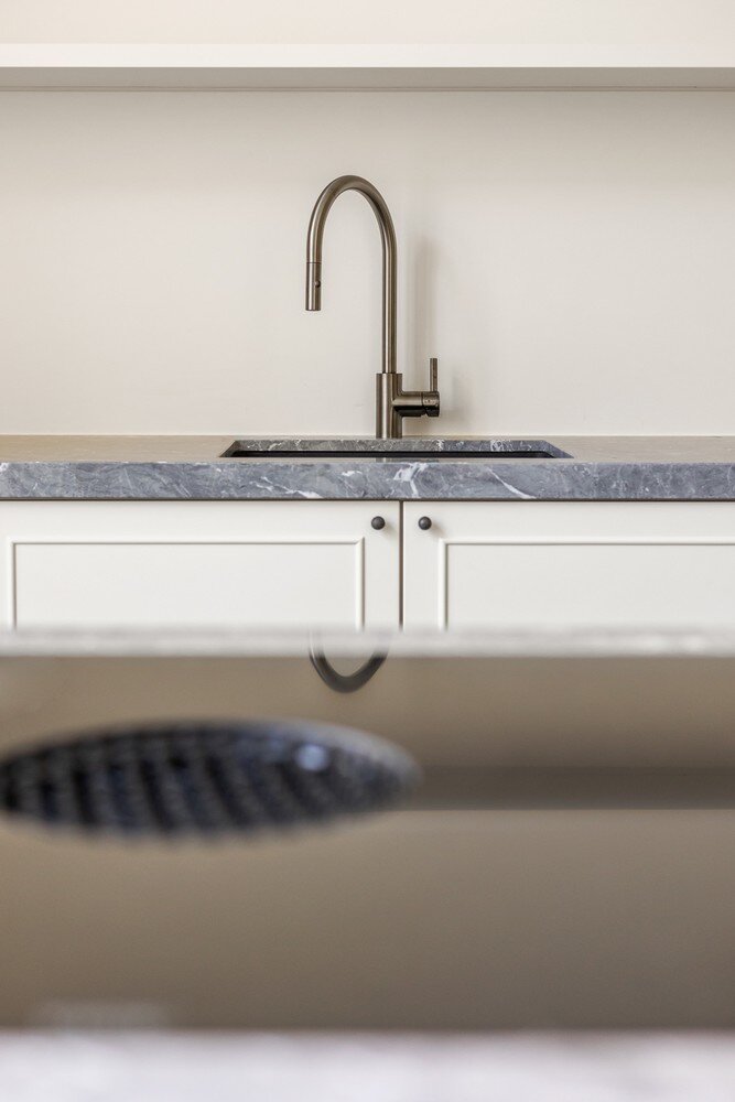 Aan de tuinzijde werd een ruime leefkeuken ingericht met hoogwaardige materialen, voorzien van een gezellige ontbijthoek en eetplaats. De harmonica glazen wand over de volledige breedte zorgt voor een naadloze connectie tussen binnen en buiten – perfect voor zomerse dagen.