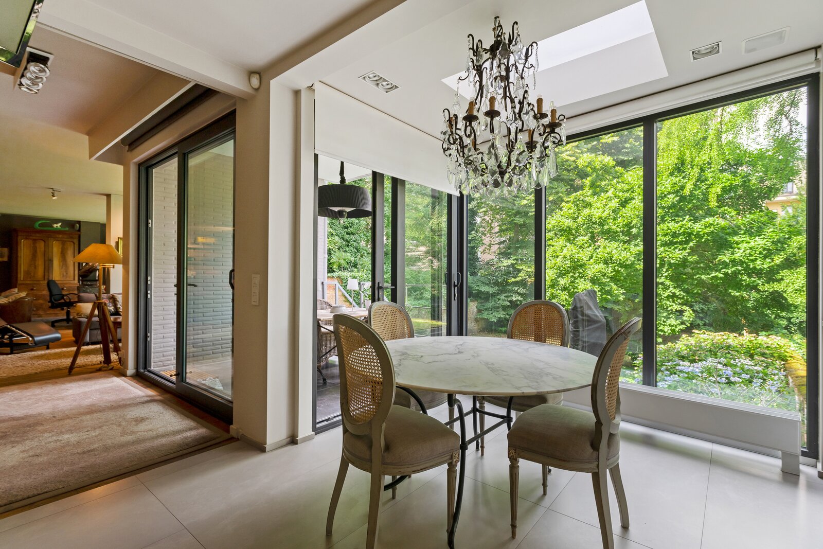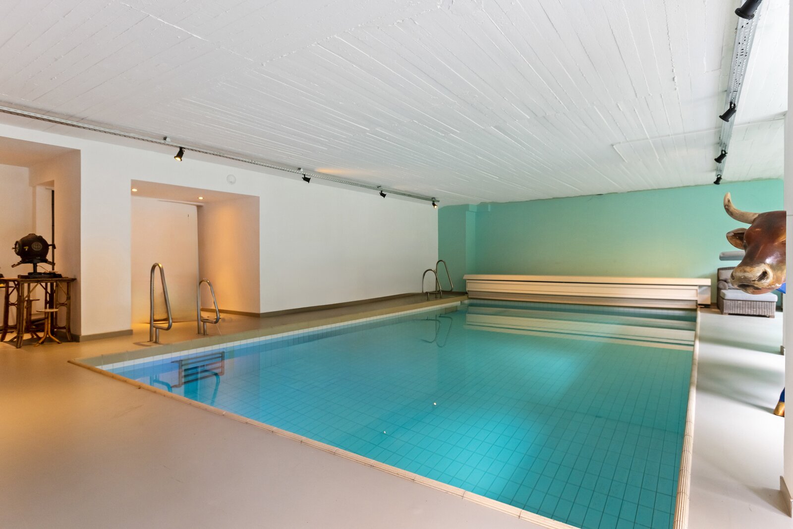 Private wellnessruimte, bereikbaar met een eigen lift. Hier geniet u van een binnenzwembad, sauna, inloopdouche, hammam, apart toilet en een uitgeruste fitnessruimte. Dankzij de volledig schuifbare ramen naar de tuin loopt deze ontspanningsruimte naadloos over in het buitenleven, wat zorgt voor een gevoel van rust en vrijheid.