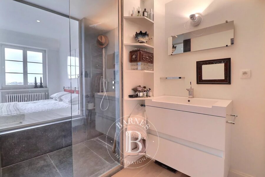 Het bestaat uit: een hal, een gastentoilet, een ruime, lichte woonkamer met open haard, een terras, een eetkamer en een volledig uitgeruste, aparte keuken. Het slaapgedeelte bestaat uit een ouderslaapkamer met aangrenzende badkamer en kleedkamer, een tweede slaapkamer, een kinderslaapkamer (of studeerkamer), een badkamer en een tweede terras aan de achterzijde.