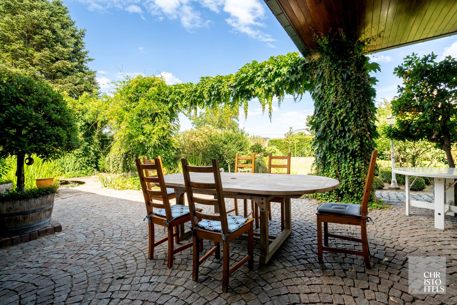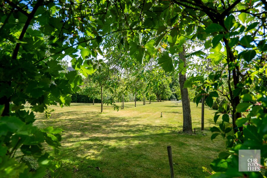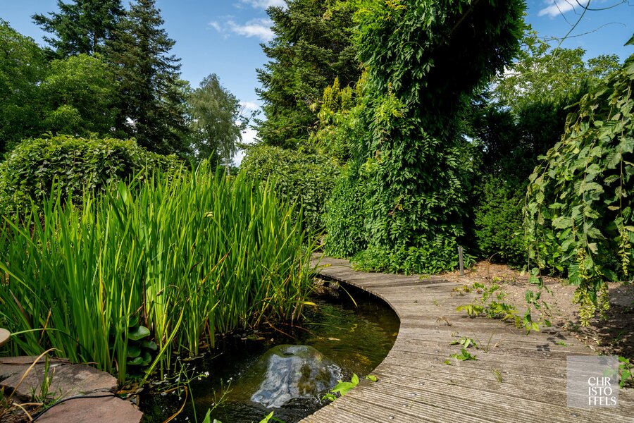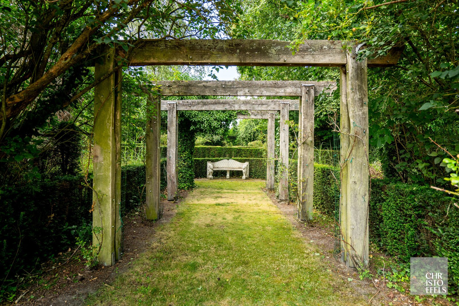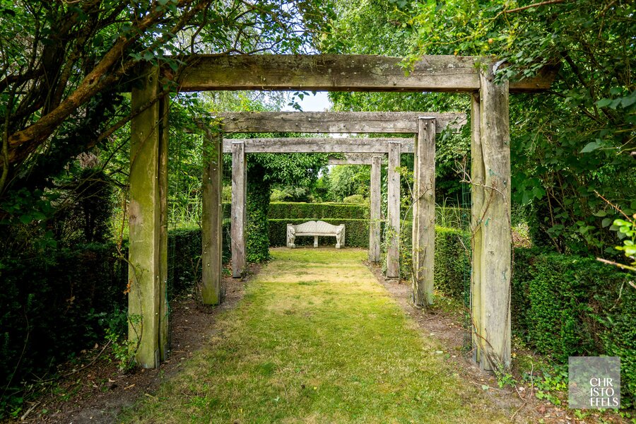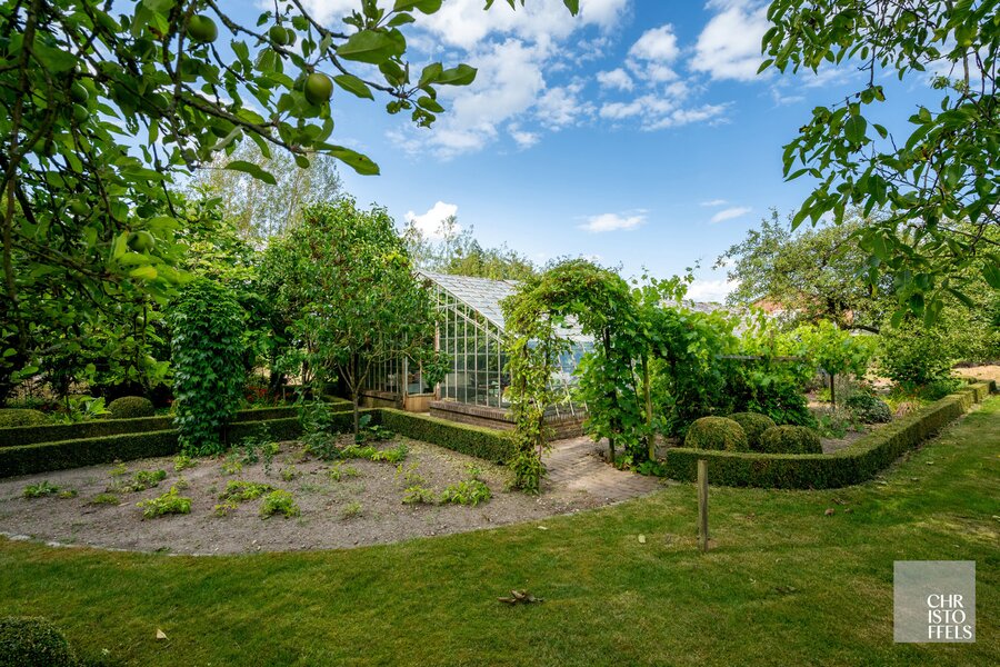 De riante parktuin is volledig aangelegd en omheind en voorzien van een bestrating in kasseien, diverse terrassen en een serre met druivenranken.