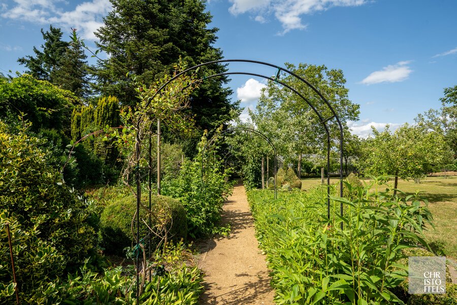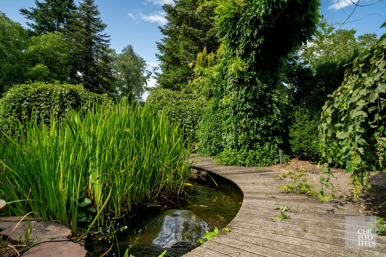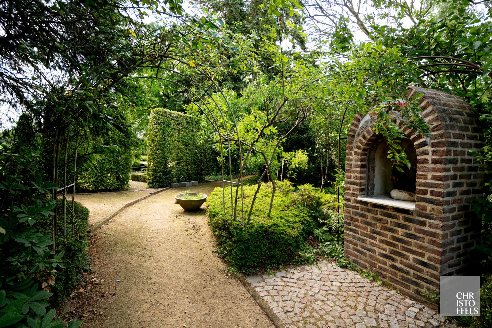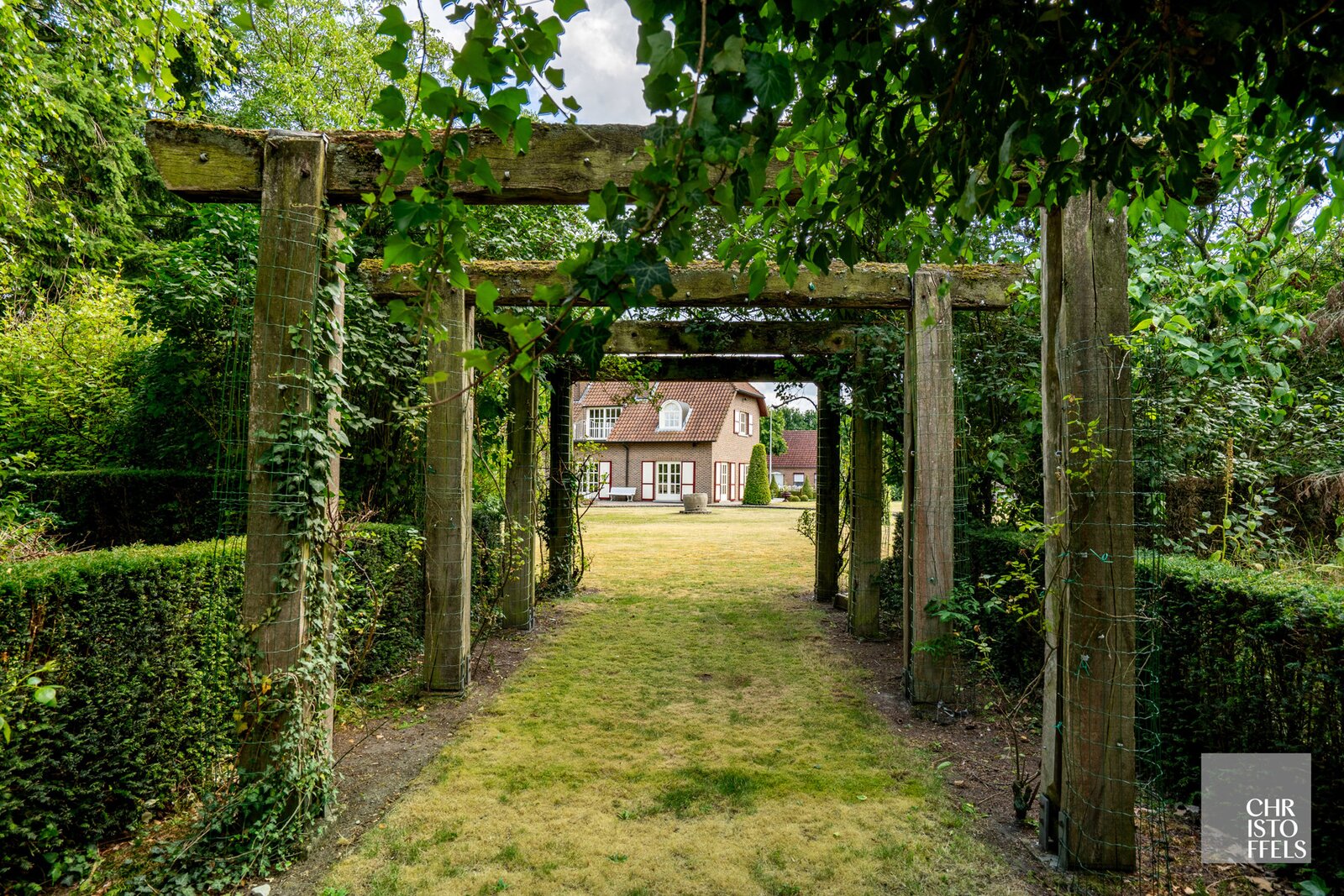 De riante parktuin is volledig aangelegd en omheind en voorzien van een bestrating in kasseien, diverse terrassen en een serre met druivenranken.