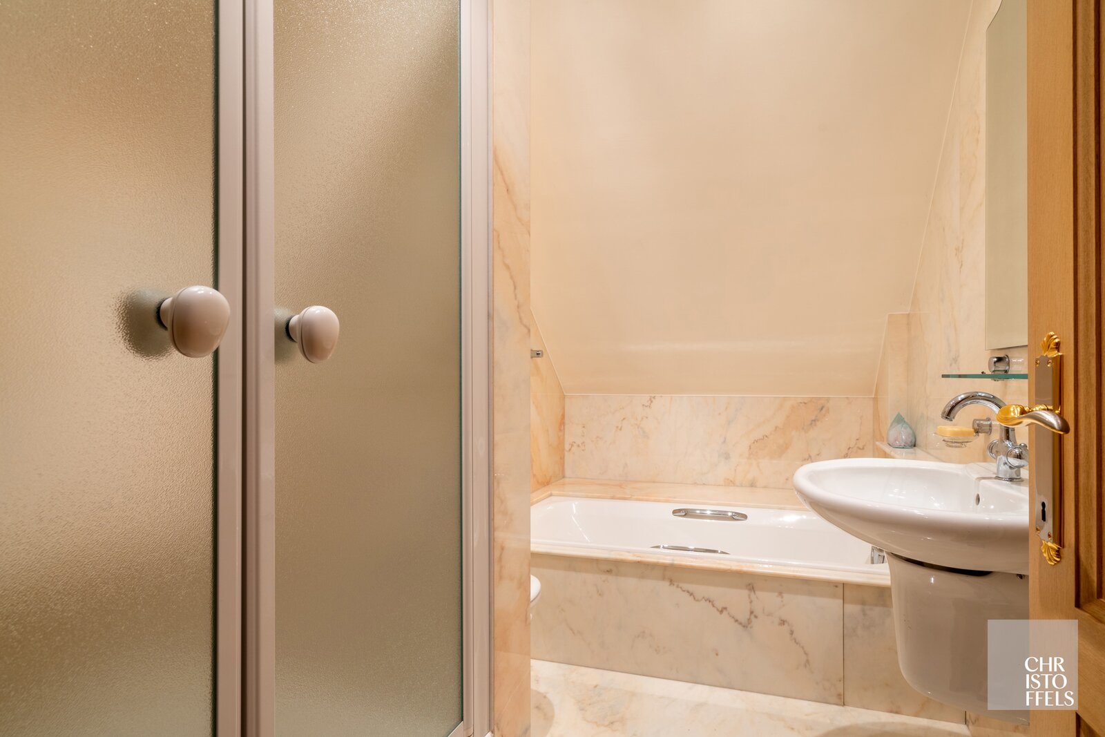 De eerste verdieping werd volledig ingericht als appartement met woonkamer, zithoek/wintertuin met uitzicht op het balkon, volledig ingerichte keuken, nachthal, apart toilet, 2 slaapkamers, een badkamer, en een bergruimte met aansluitingen voor wasmachine en droogkast. Via een aparte trap in de garage op het gelijkvloers kan bovendien nog een 5de slaapkamer of hobbykamer bereikt worden. Deze laatste ruimte werd eveneens voorzien van een wastafel.