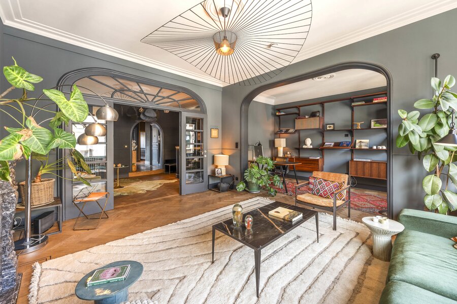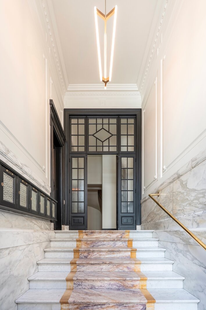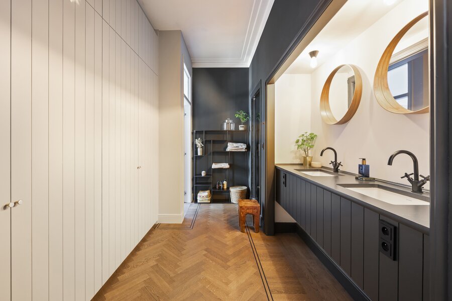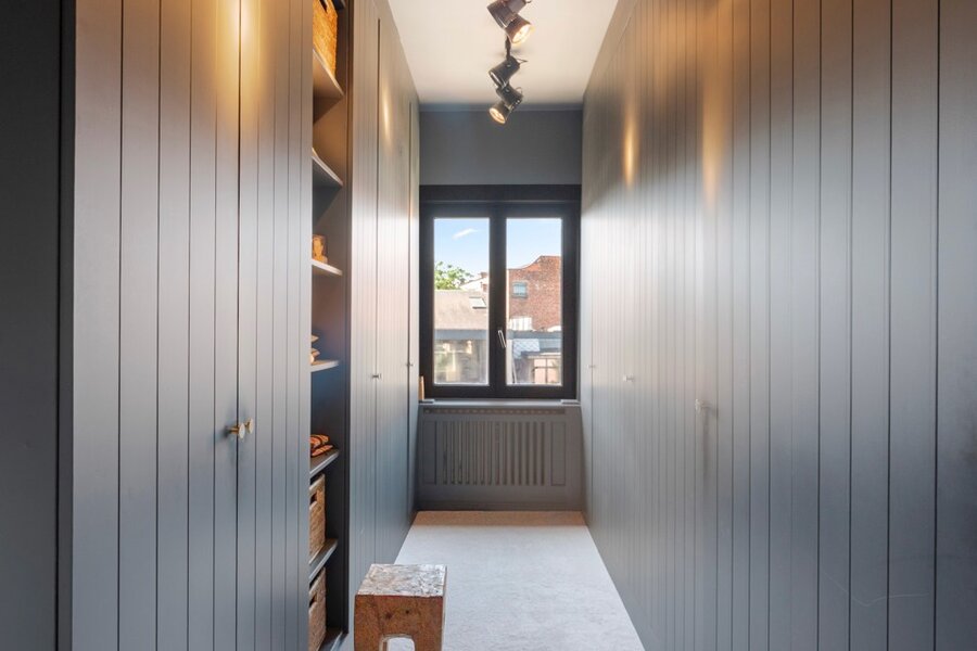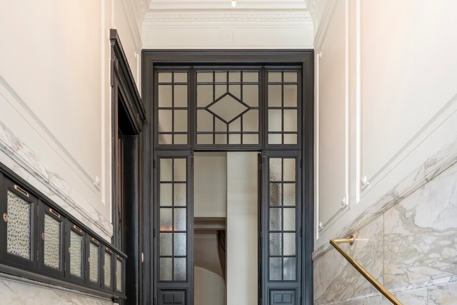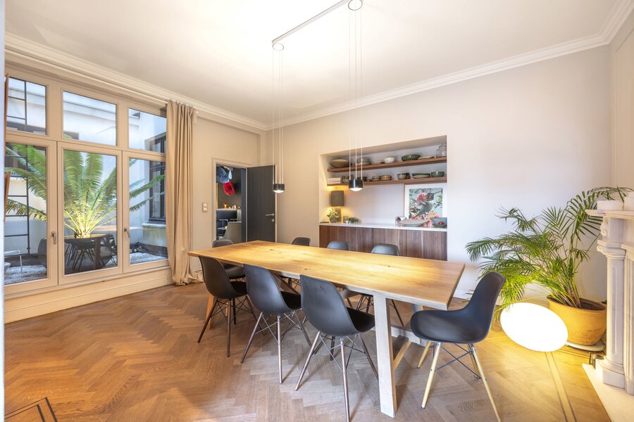 In 2023 werd het appartement zelf nog verfijnd gerestyled door de eigenaars, met oog voor detail en gebruik van hoogwaardige materialen – alles is tot in de puntjes afgewerkt. Het appartement beslaat de volledige verdieping, wat zorgt voor maximale privacy. Een royale inkomhal met op maat gemaakte bar verwelkomt u in een warme, uitnodigende sfeer. De leefruimtes zijn afgewerkt met klassieke visgraatparket, en aan de voorzijde bevindt zich een lichte woonkamer met grote raampartijen en een fraaie gevelbreedte.