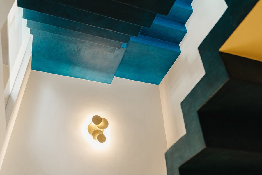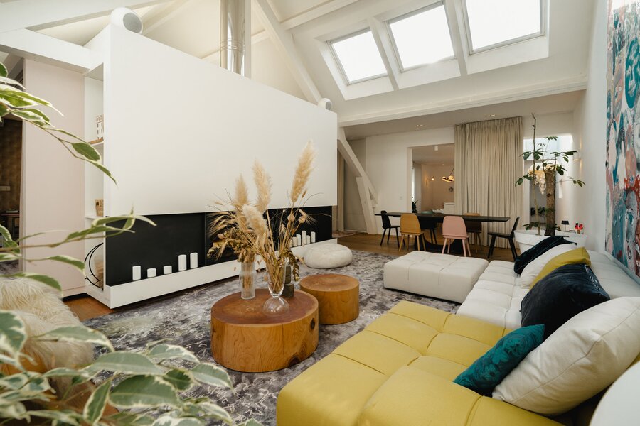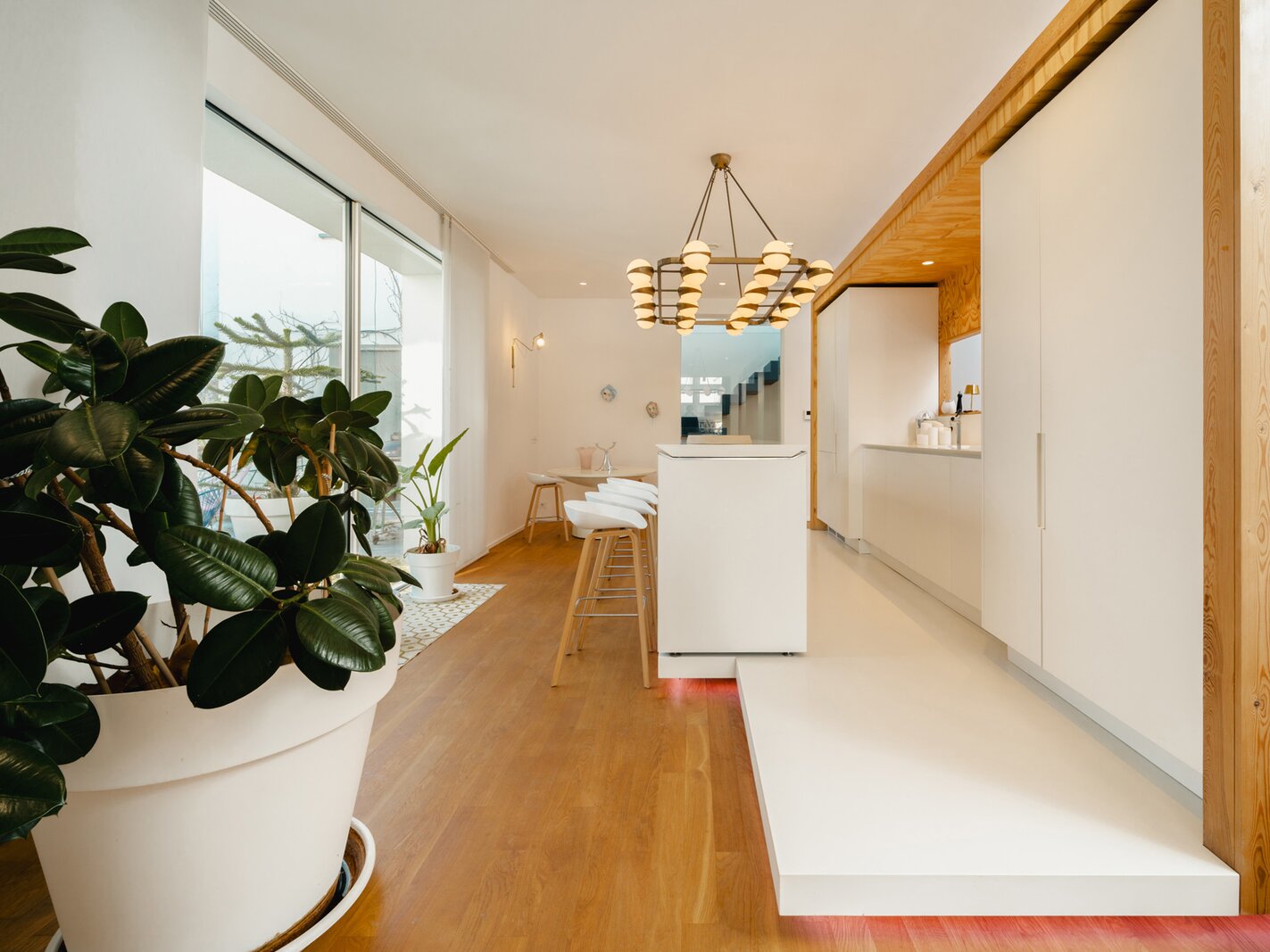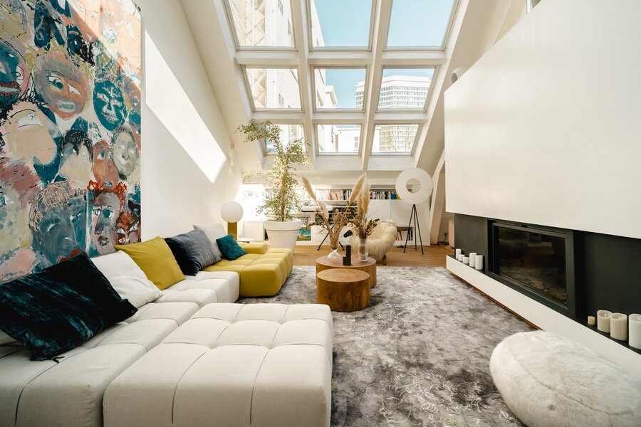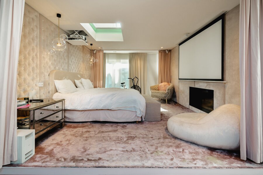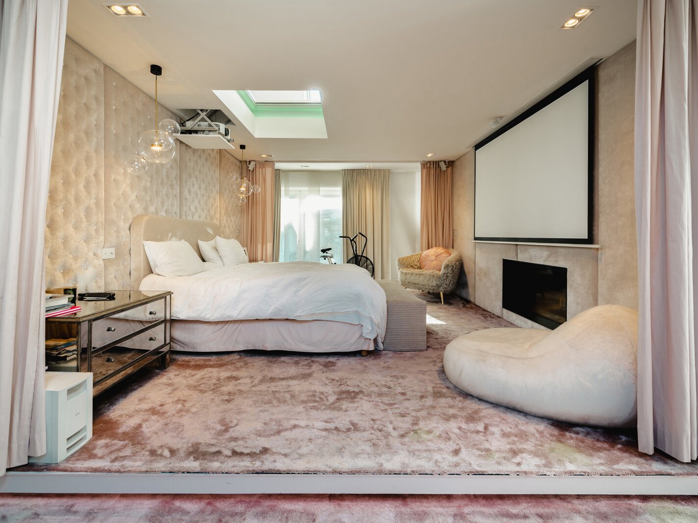 Op het gelijkvloers vindt u een mooie inkomhal met een designtrap die toegang biedt tot de woning en de parkeerplaatsen. Op de eerste verdieping bevindt zich een ruime keuken van ongeveer 45 m² die uitgeeft op een groot, privéterras, een royale woonkamer van ongeveer 47 m² met open haard, een master bedroom van 50m² en een badkamer van bijna 40m²; een slaapkamer van ongeveer 14 m² met eigen douchekamer vervolledigt deze verdieping.De tweede verdieping beschikt over een slaapkamer van ongeveer 16m² met eigen douchekamer en een prachtig terras. In de kelder vindt u een berging en een stookruimte.