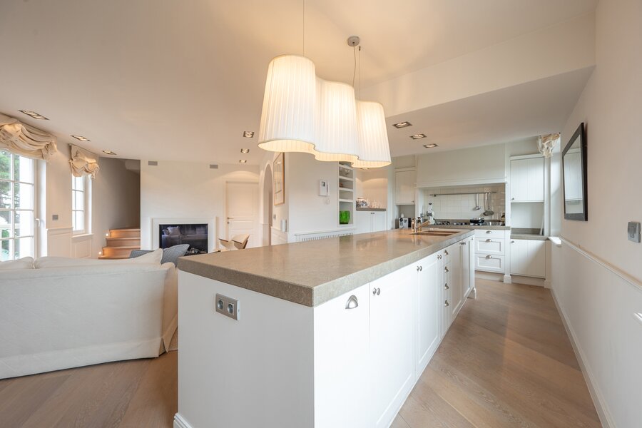 Via de inkomhal met vestiaire en gastentoilet betreedt u een sfeervolle leefruimte met een stijlvolle gashaard en grote raampartijen die zorgen voor een aangename lichtinval. De open keuken met natuurstenen eiland en knusse ontbijthoek sluit naadloos aan op de eetkamer, prachtig gesitueerd in de karaktervolle toren van het gebouw. Op dit niveau bevindt zich tevens een ruime, lichtrijke slaapkamer met dressing en en-suite badkamer.