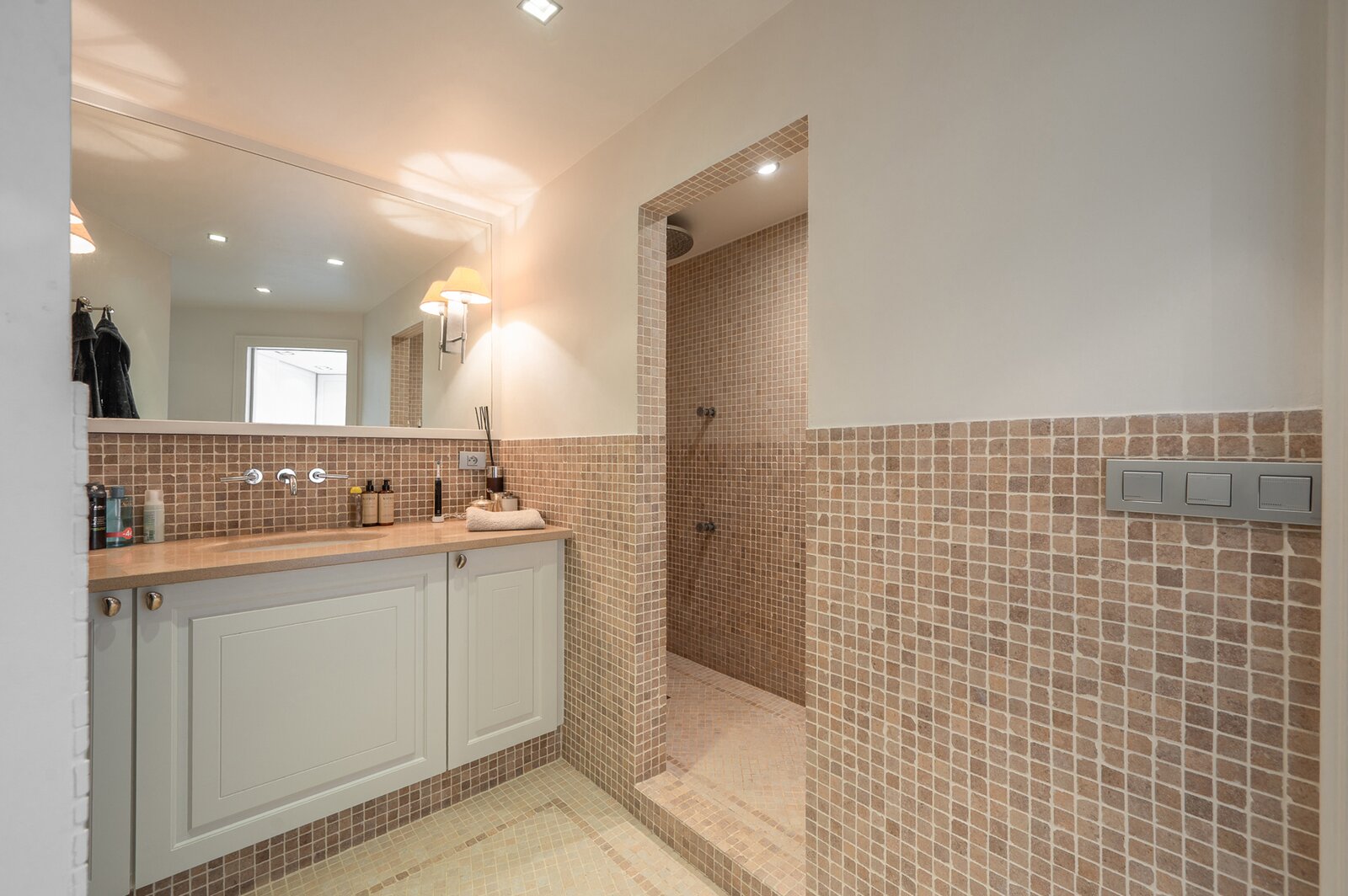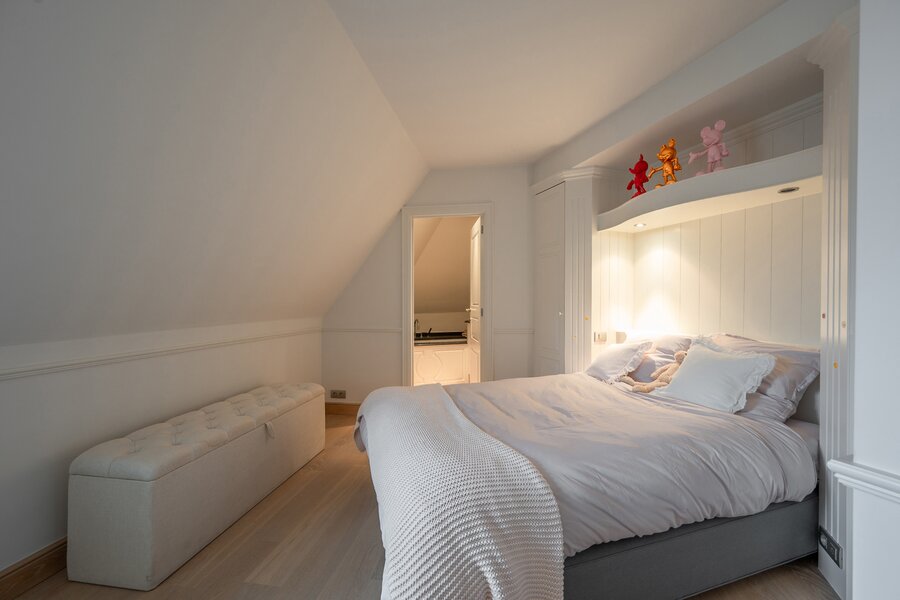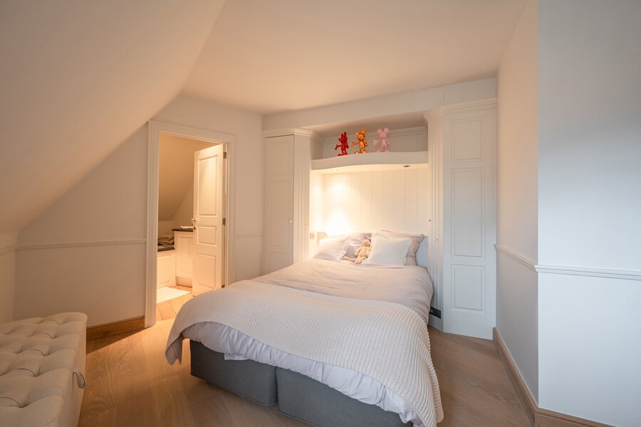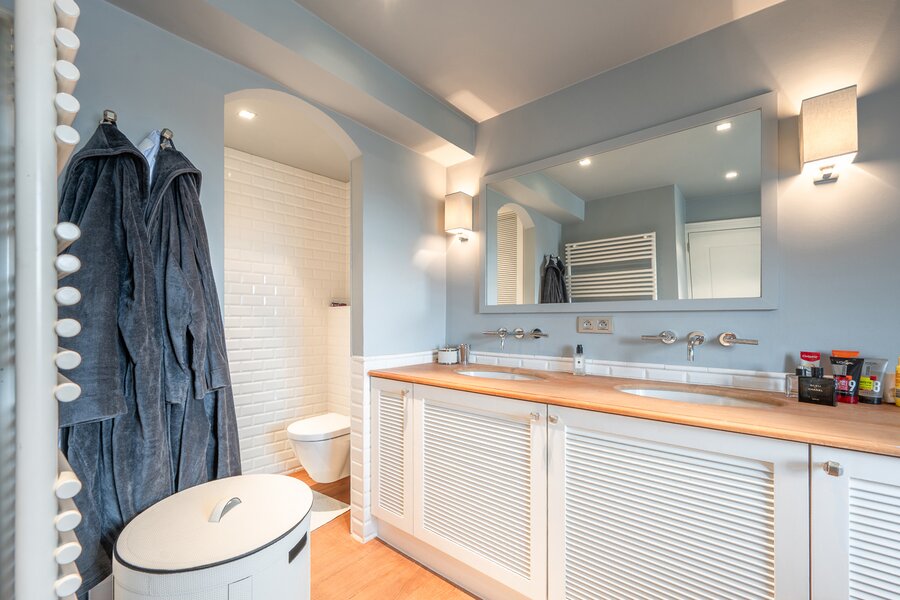 Op de bovenverdieping bevinden zich 2 royale slaapkamers, elk voorzien van talrijke ingemaakte kasten en een eigen badkamer – ideaal voor familie of gasten.