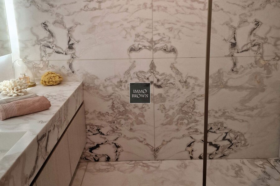 De leefruimte is zuidgericht en geniet van een overvloed aan natuurlijk licht dankzij de grote raampartijen. Het zonnige terras biedt een open en groen zicht op het residentiële Zoute. De op maat gemaakte eetruimte met ingebouwde design-zitbank sluit perfect aan op de luxueuze open keuken, uitgevoerd in Oyster White marmer en voorzien van Miele-inbouwtoestellen.