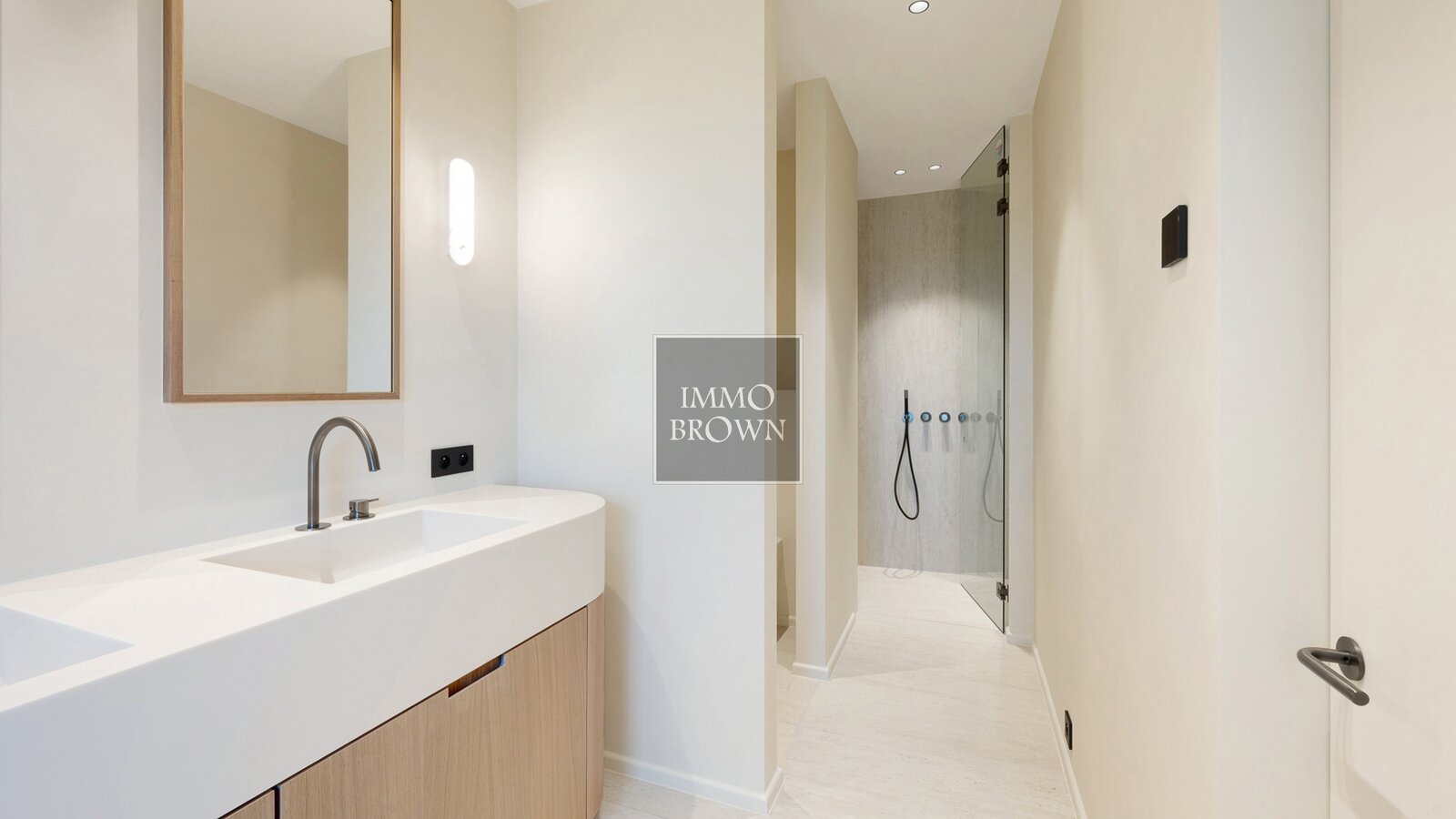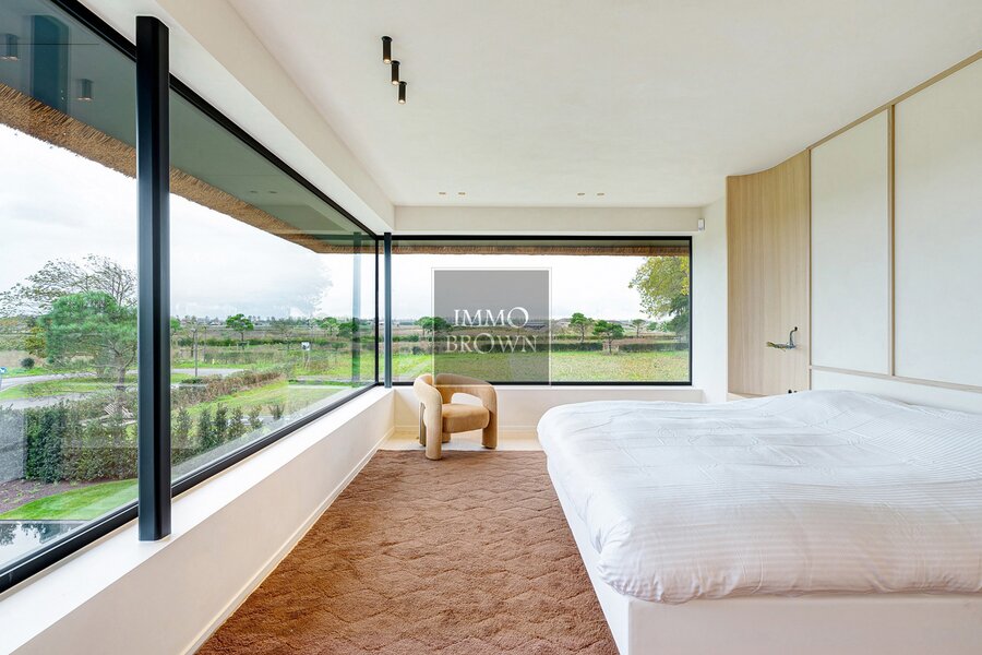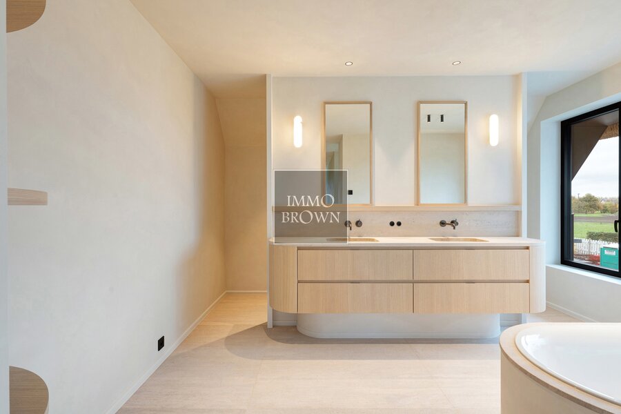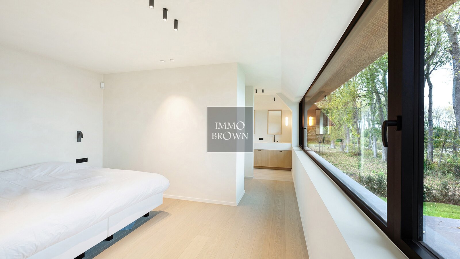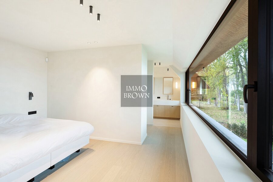 De masterbedroom biedt ultiem comfort met een riante inloopdressing, directe toegang tot de tuin, en een luxueuze badkamer uitgerust met ligbad, inloopdouche, dubbele lavabo en toilet.