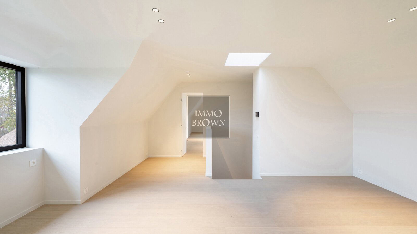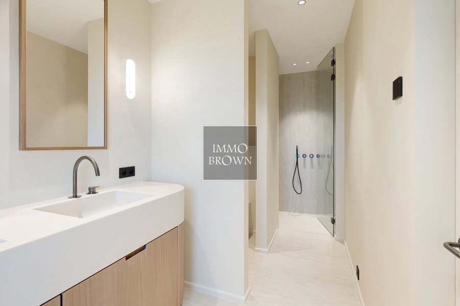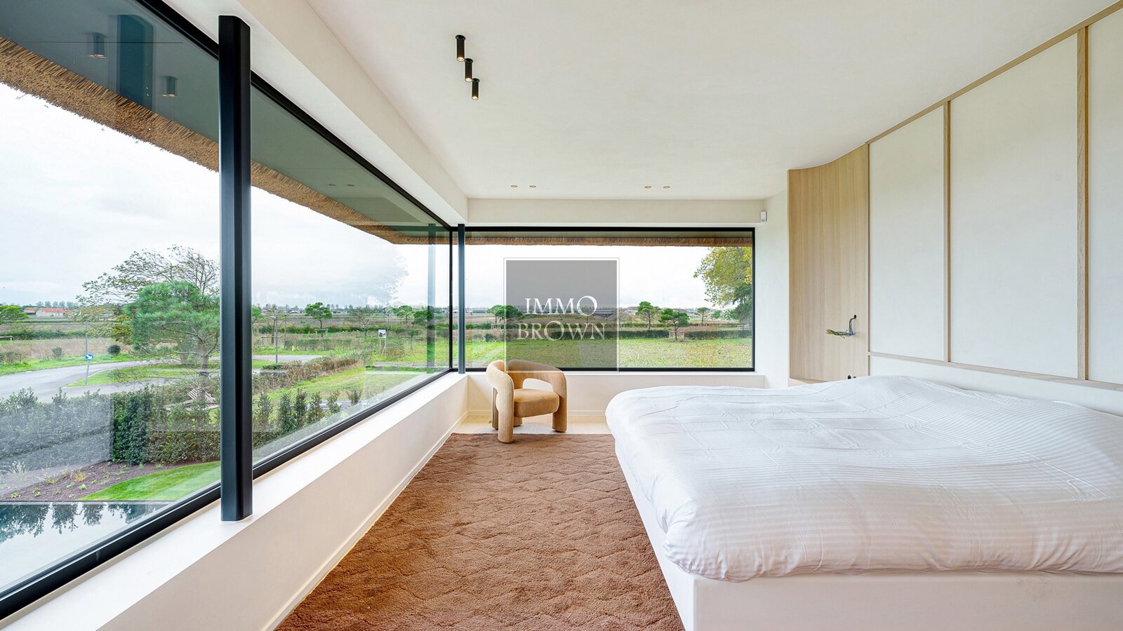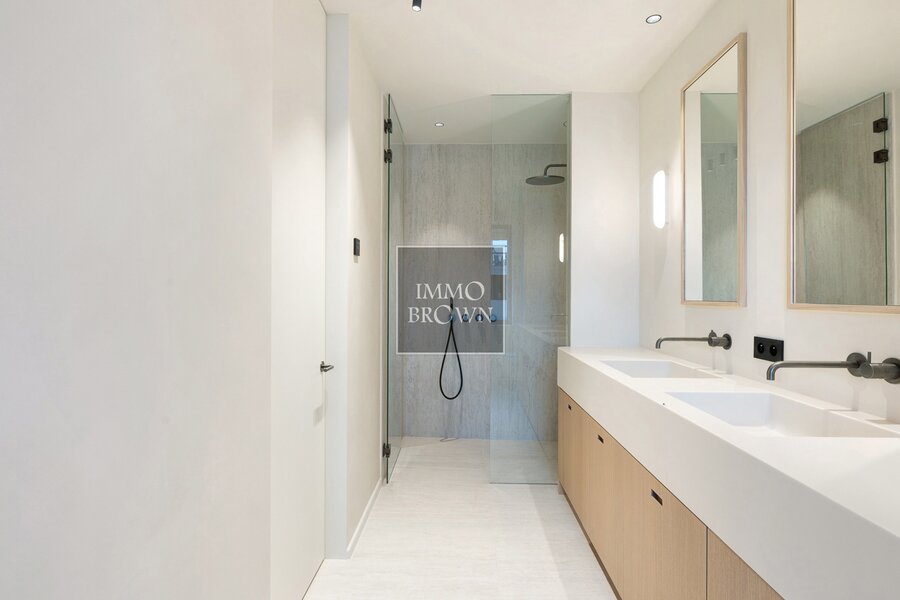 De masterbedroom biedt ultiem comfort met een riante inloopdressing, directe toegang tot de tuin, en een luxueuze badkamer uitgerust met ligbad, inloopdouche, dubbele lavabo en toilet.