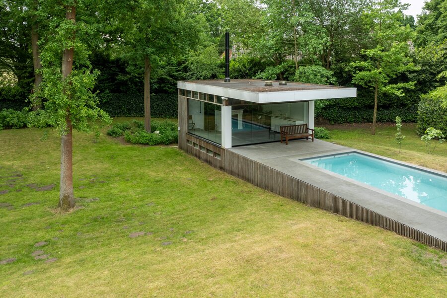 Genieten aan het poolhouse met openhaard, keuken en terras.