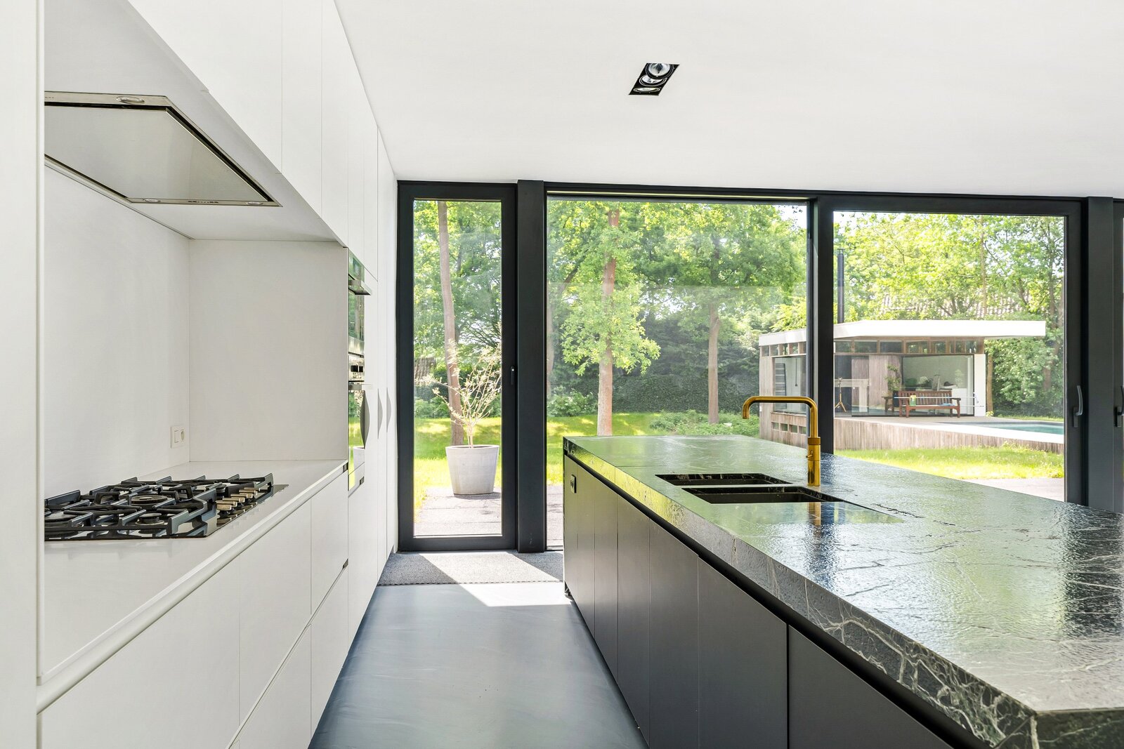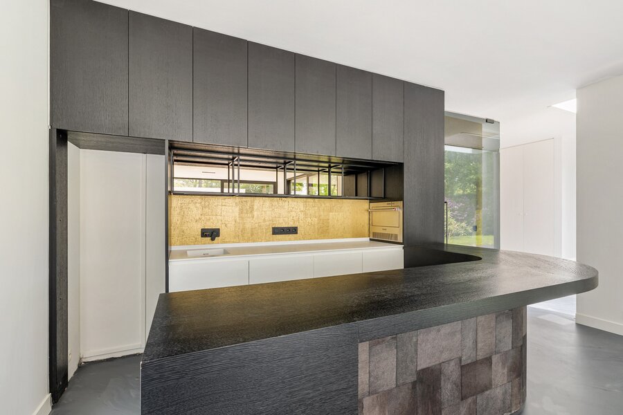 Aansluitend de leefruimte treffen we de zeer royale leefkeuken met volledig geïnstalleerd eiland.