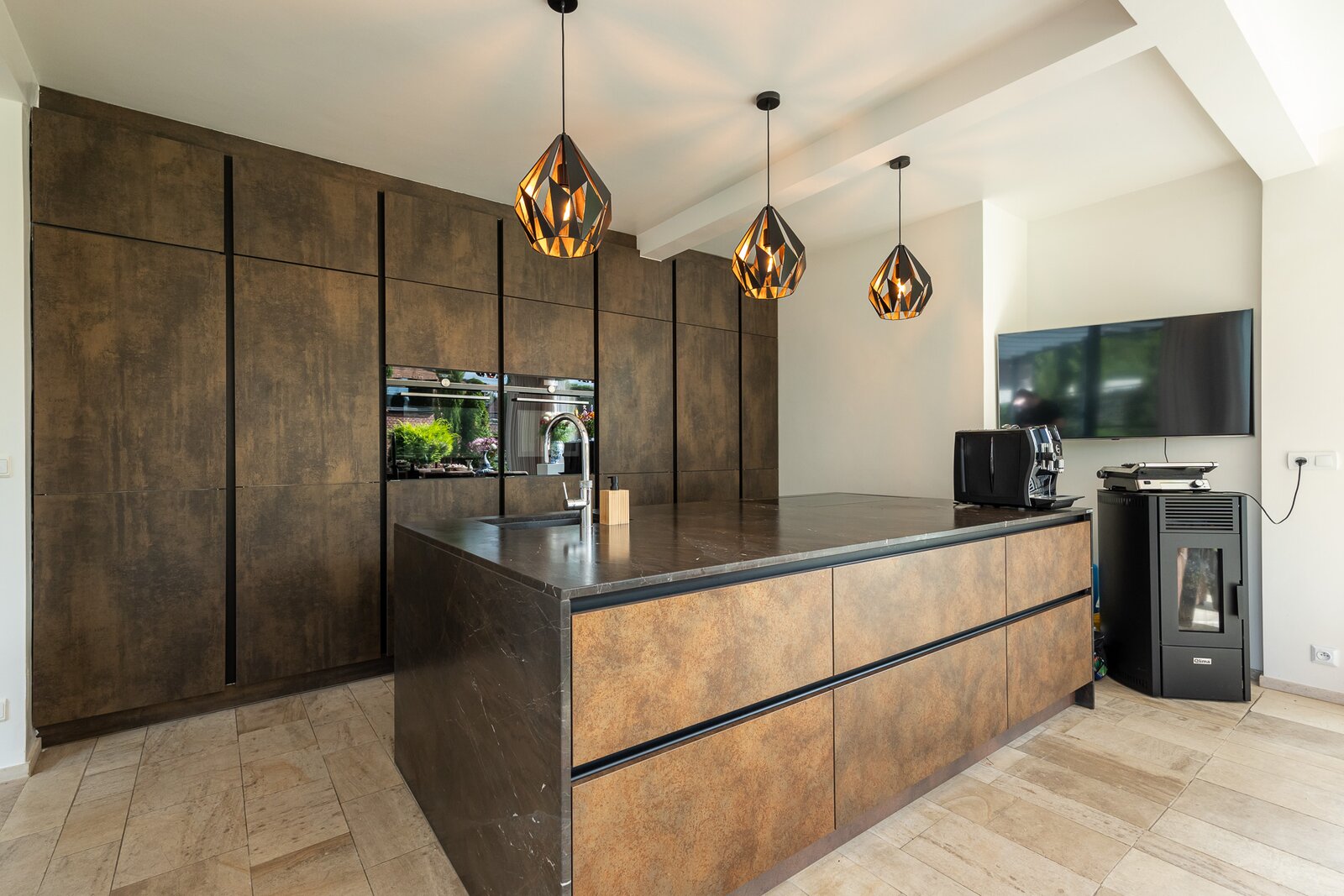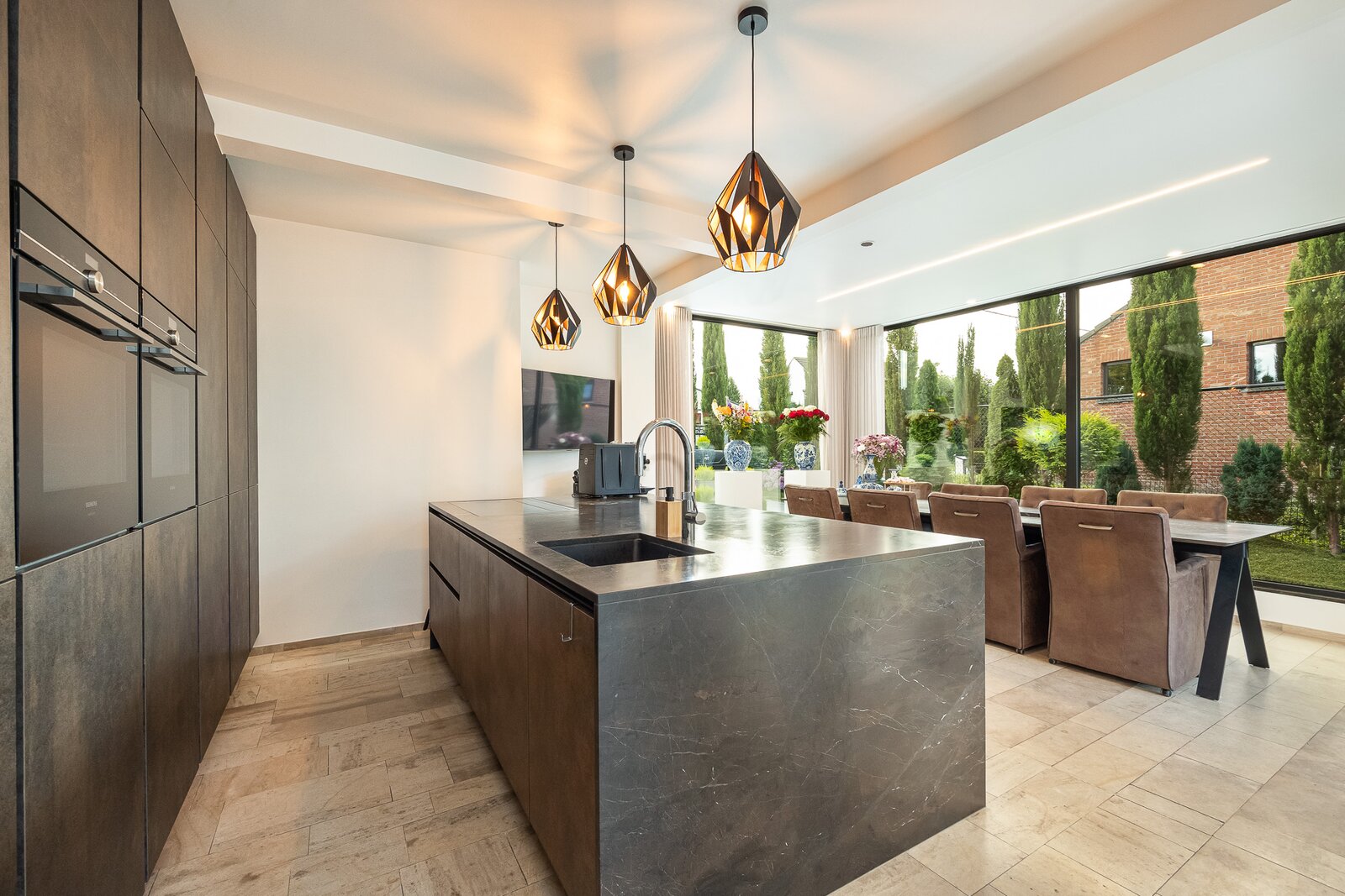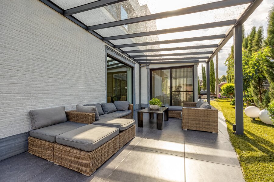 De keuken en woonkamer geven toegang tot het terras , wat grotendeels overdekt werd.