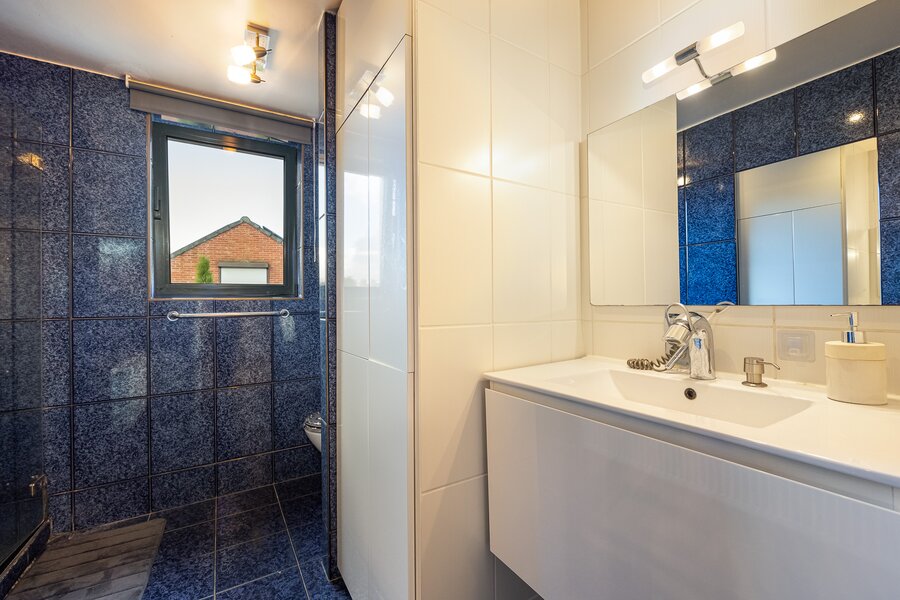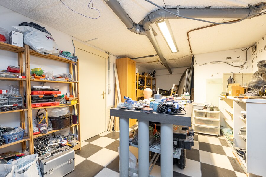 Aan de rechterzijde is er een zij-inkom met tweede toilet en toegang naar de grote kelderruimte met een 6-tal compartimenten.