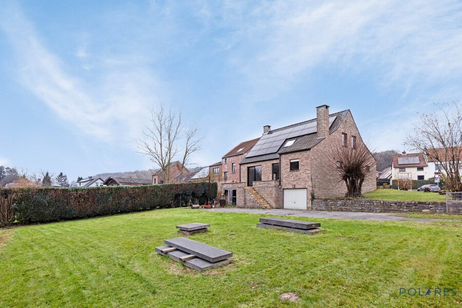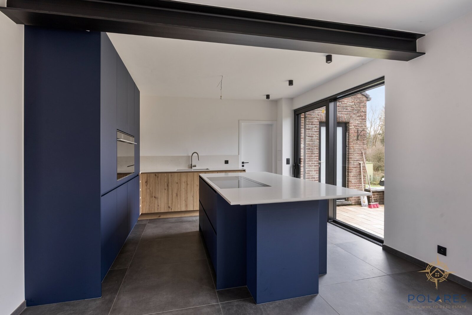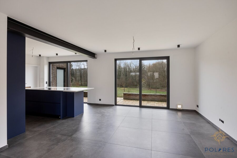 Gelijkvloers: inkomhal, gastentoilet, lichtrijke leefruimte met open keuken, inpandige garage/berging, douchekamer en grote schuiframen die rechtstreeks toegang geven tot terras en tuin met uniek uitzicht.